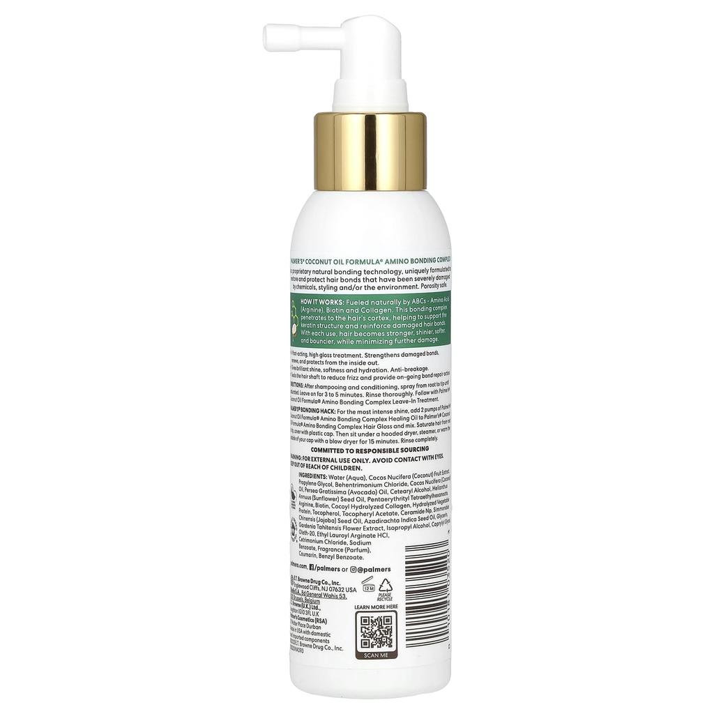 Как пользоваться продуктом: После мытья шампунем и использования кондиционера распылите средство от корней волос до кончиков, пока корни волос не увлажнятся.. Оставьте на 3-5 минут.. Тщательно промыть. Затем используйте несмываемый уход с аминокислотным комплексом Palmer's Coconut Oil Formula®.. Совет по склеиванию Palmer's®: Для интенсивного блеска смешайте 2 нажатия на масло Palmer's Coconut Oil Formula® Amino Bonding Complex Healing Oil с блеском для волос Palmer's® Coconut I Formula® Amino Bonding Complex.. Намочите волосы от корней до кончиков и наденьте полиэтиленовую шапочку.. Затем поместите под колпак сушилки или пароварки или прогрейте внешнюю часть крышки сушилкой в течение 15 минут.. Тщательно промойте.
