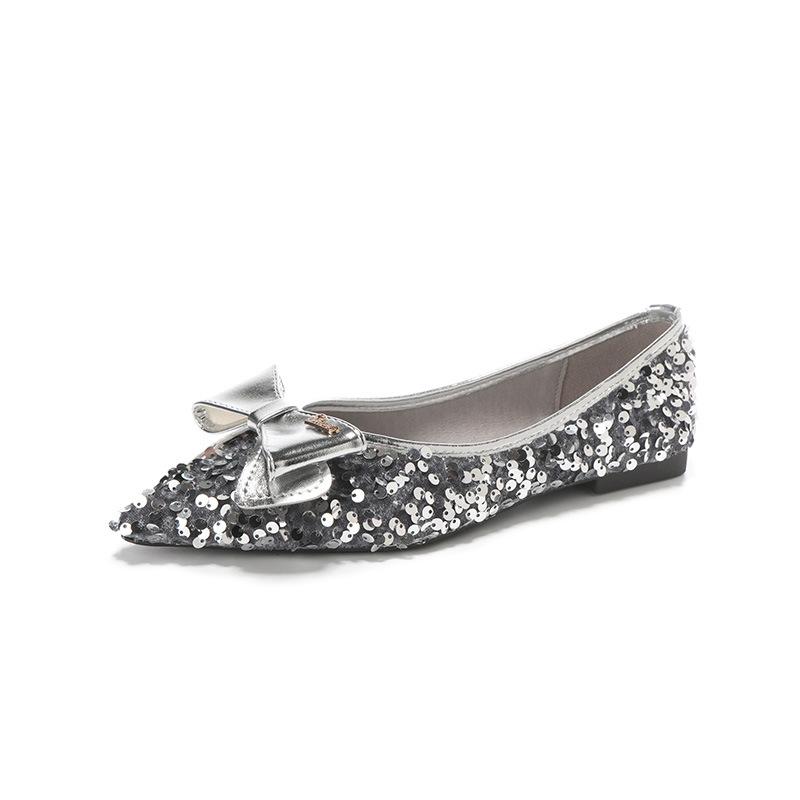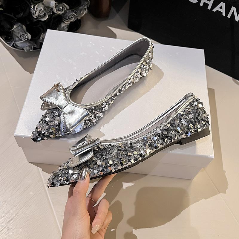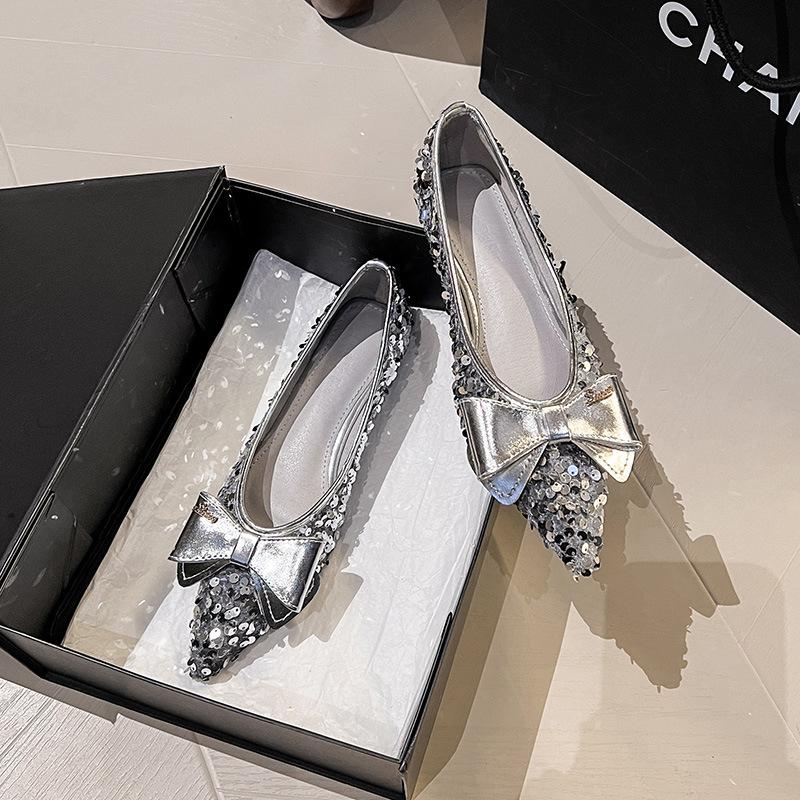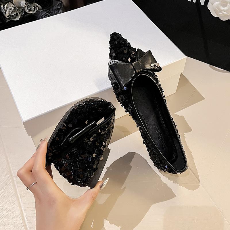 Остроносые одинарные туфли женские 2024 весна новые туфли на мягкой подошве с бантом и пайетками мелкий вырез плоская подошва