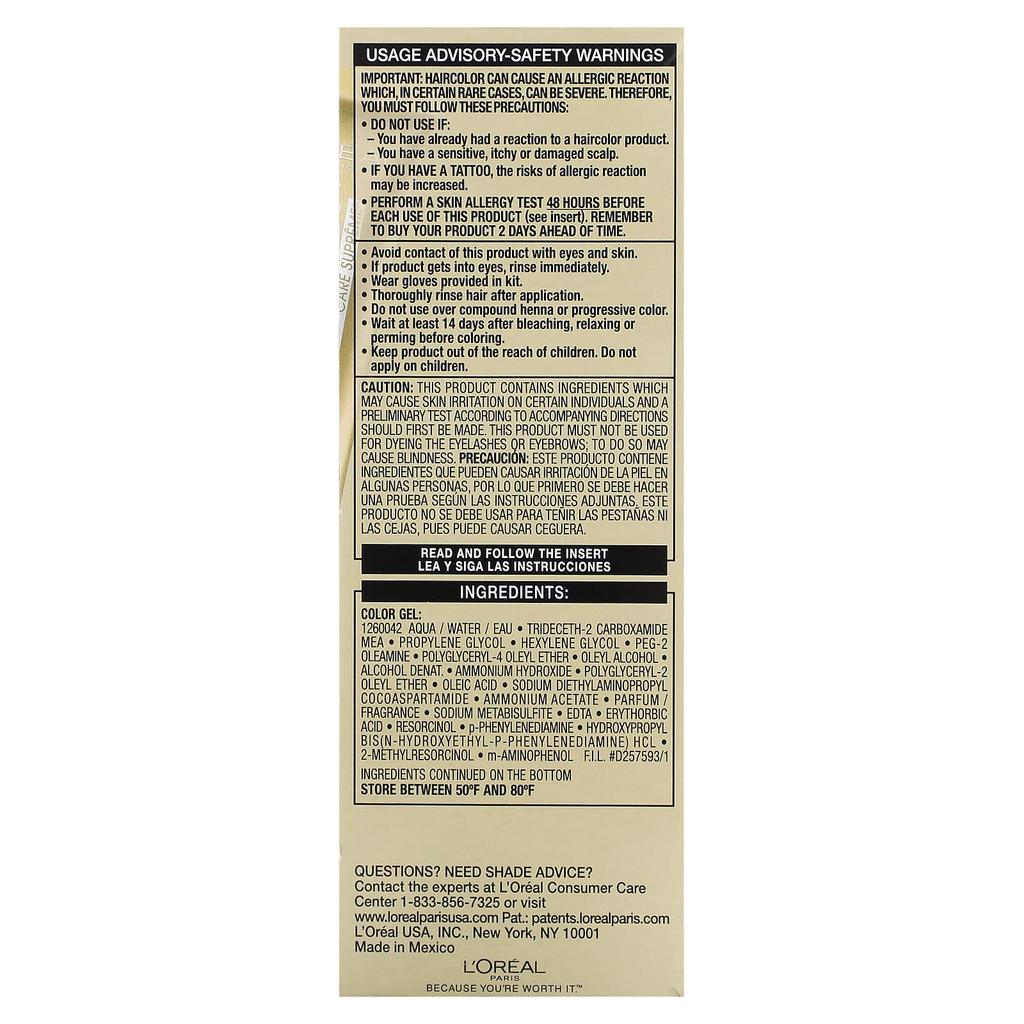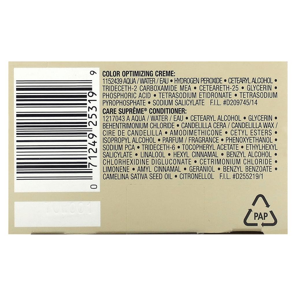 Ингредиенты: Цветной гель: Очищенная вода, тридецет-2 карбоксамид МЭА, пропиленгликоль, гексиленгликоль, ПЭГ-2 олеамин, полиглицерил-4 олеиловый эфир, модифицированный олеиловый спирт, гидроксид аммония, полиглицерил-2 олеиловый эфир, олеиновая кислота, диэтиламинопропилкокоаспартамид натрия, ацетат аммония, отдушка, метабисульфит натрия, ЭДТА, эриторбиновая кислота, резорцин, п-фенилендиамин, гидроксипропилбис(н-гидроксиэтил-п-фенилендиамин)HCl 2-метилрезорцин, м-аминофенол. Крем для оптимизации цвета: Очищенная вода, перекись водорода, цетеариловый спирт, тридецет-2 карбоксамид МЭА, цетеарет-25, глицеринфосфат, тетранатрия этидронат, тетранатрийпирофосфат, салицилат натрия. Кондиционер Care Supreme®: Очищенная вода, цетеариловый спирт, хлорид бегентримония глицерина, воск канделильского воска, амодиметикон, цетиловый эфир изопропилового спирта, отдушка, феноксиэтанол натрия PCA тридецет-6, токоферола ацетат, этилгексилсалицилат, щелочь Nalul, гексилциннамал, бензиловый спирт, диглюконат хлоргексидина, хлорид цетримония лимонен, амилциннамал, гераниол, бензилбензоат (камелия посевная) масло семян, цитронеллол.