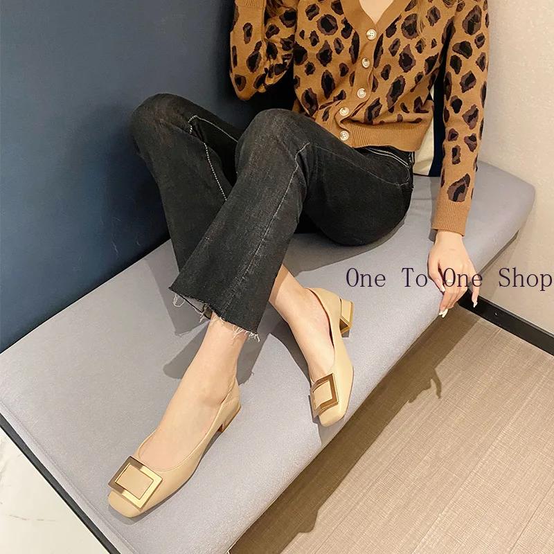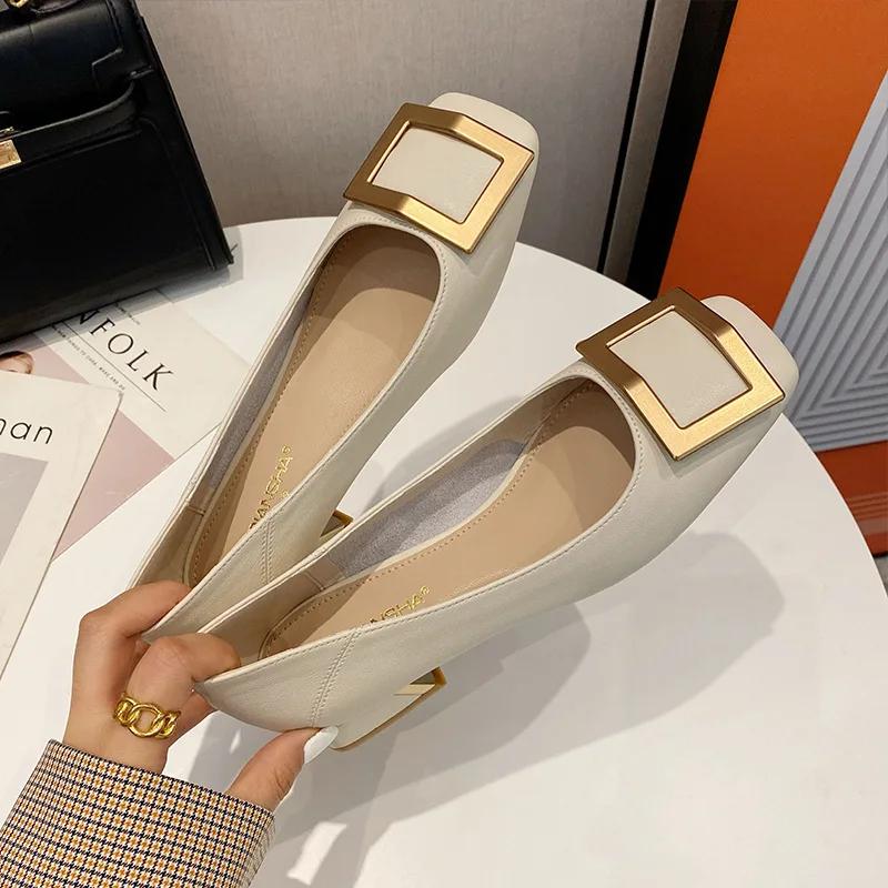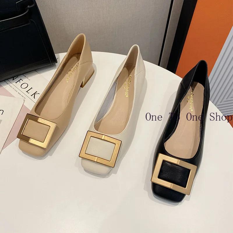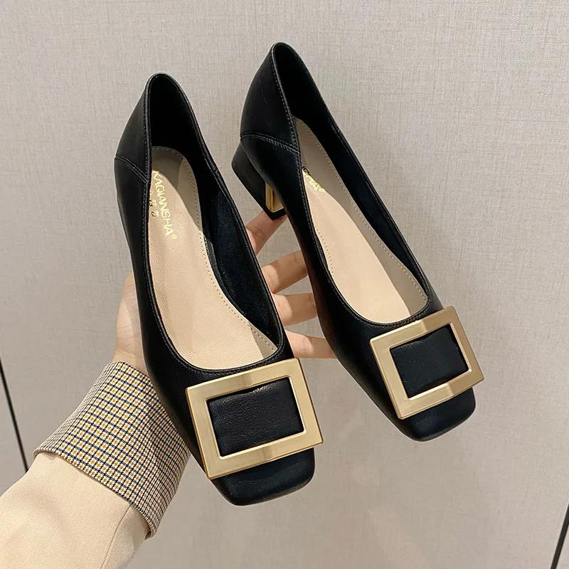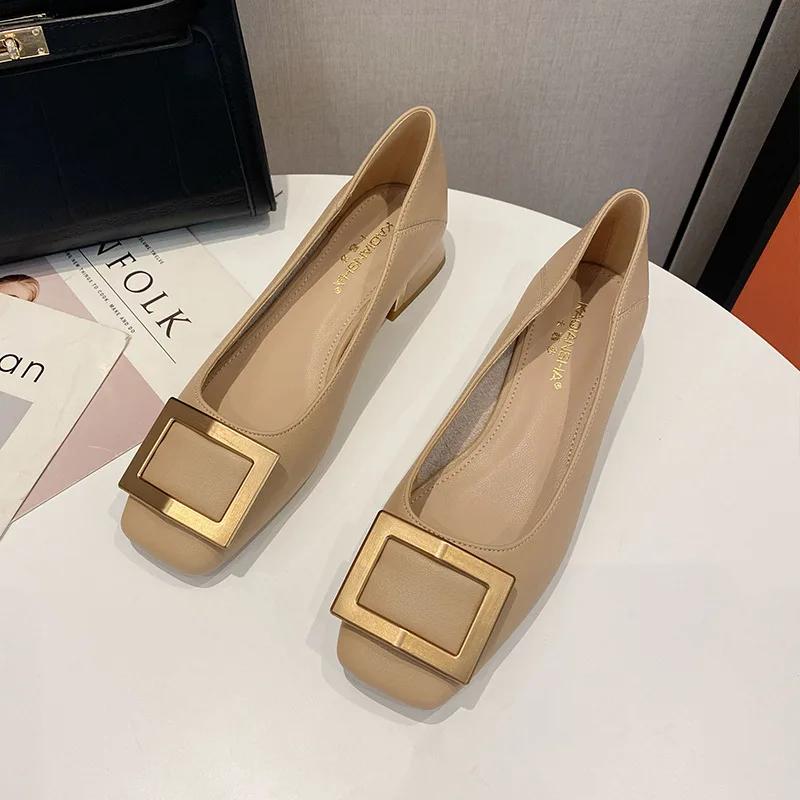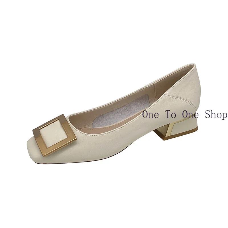 Кожаные одинарные туфли для женщин 2024 года, летние новые металлические квадратные пряжки, женские туфли на среднем каблуке, корейские мягкие кожаные туфли