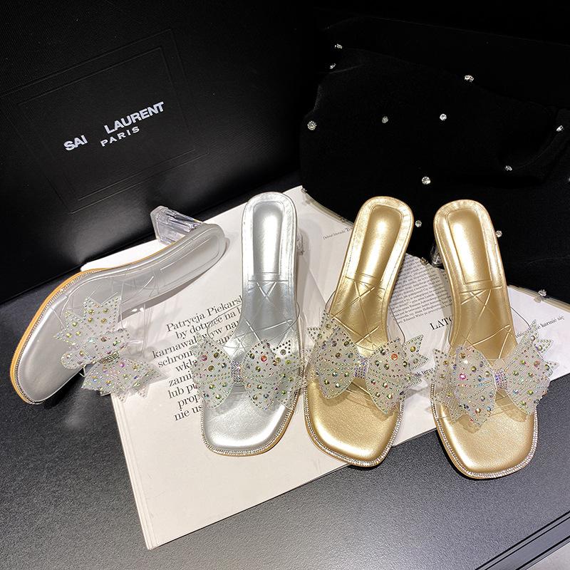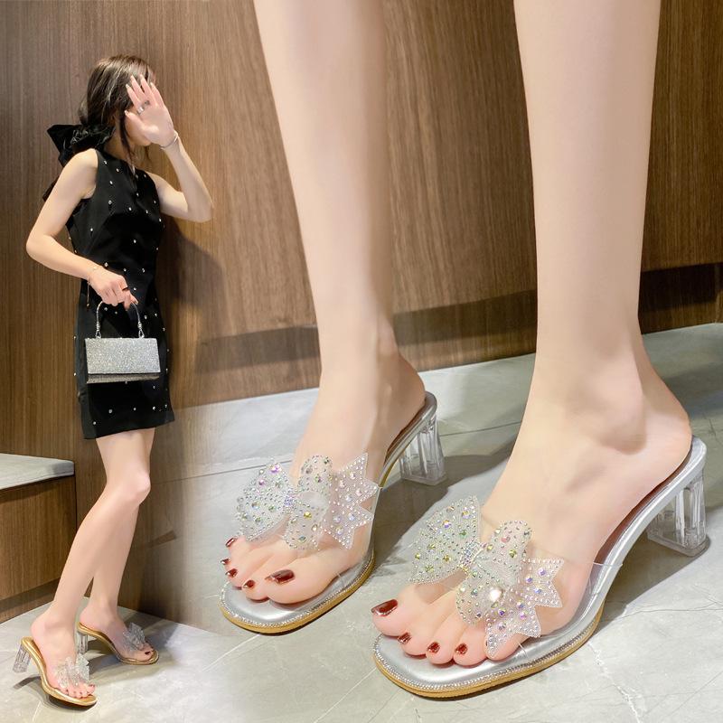 Лето 2024 года, новые универсальные тапочки с юбкой, прозрачные босоножки на толстом каблуке для женщин, прозрачные высокие каблуки