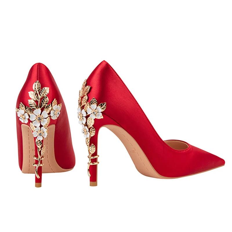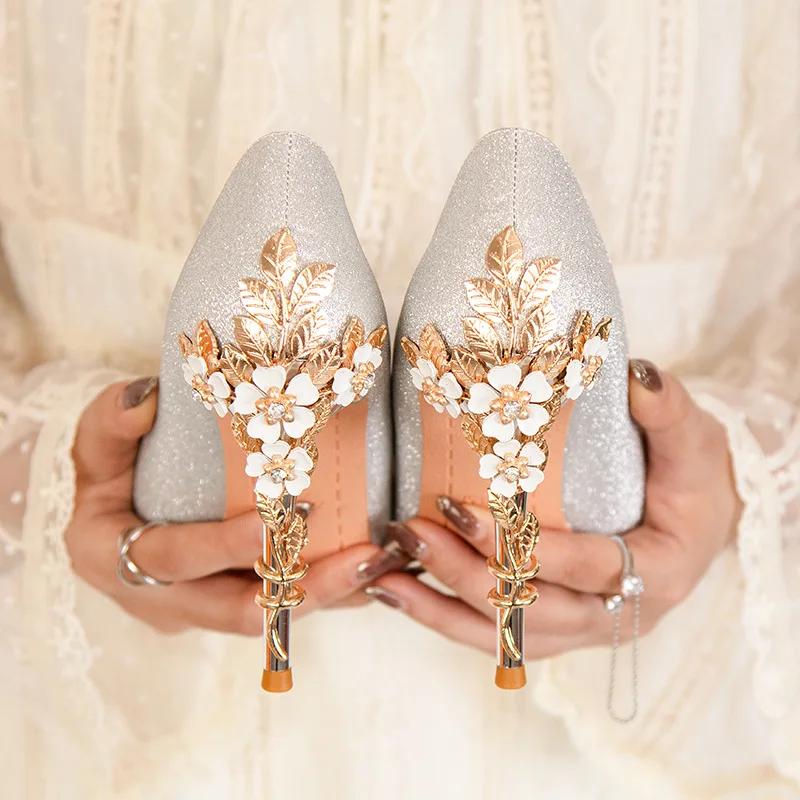Роскошные металлические цветочные туфли на высоком каблуке, женская свадебная обувь, женские элегантные туфли на шпильках для свадьбы, женские туфли-лодочки
