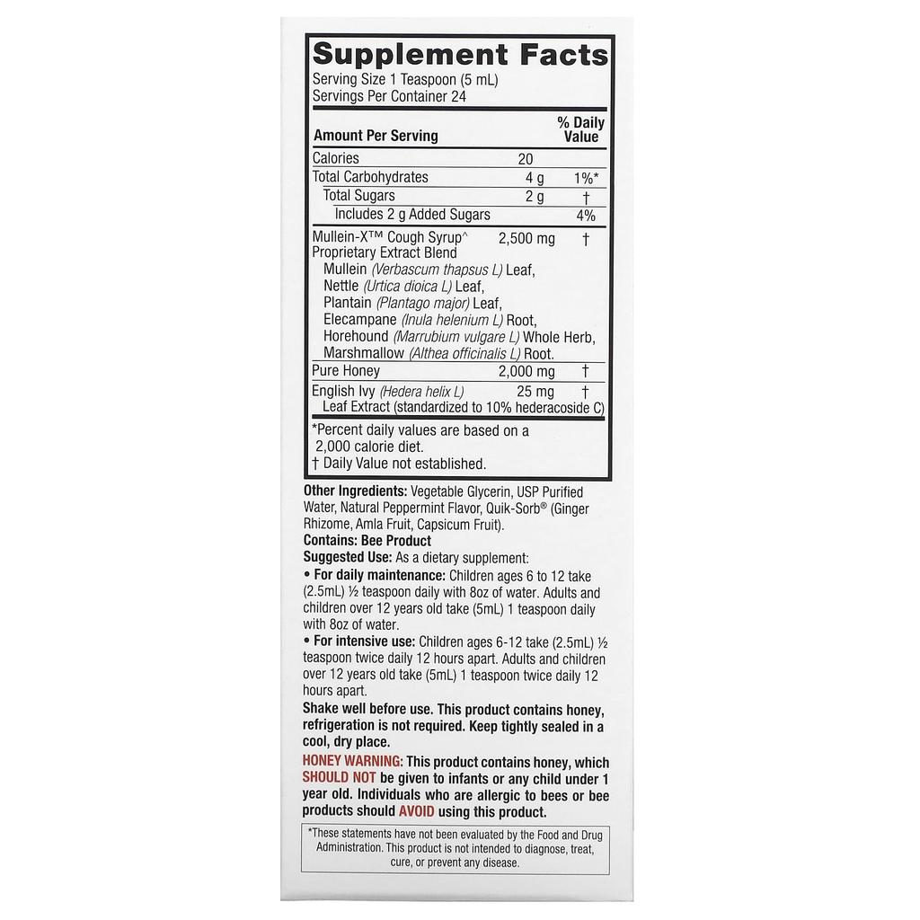 Описание товара: Облегчает кашель и выводит мокроту. Способствует здоровью верхних дыхательных путей. Добавка. Не содержит ГМО. Не содержит глютена. Не содержит алкоголя. Не содержит токсичных препаратов. Не вызывает сонливости. Содержит Quick-Sorb®. Сироп от кашля Mullein-X™ от Nature's Answer — это травяная добавка. Натуральная смесь ингредиентов, разработанная с использованием идей современного и традиционного траволечения для поддержания здоровья верхних дыхательных путей.. Разработан для очищения от слизи и успокоения раздраженного горла.. Mullein-X — единственная формула, не вызывающая сонливости, не содержащая спирта и глютена, содержащая фирменную смесь натуральных ингредиентов Quik-Sorb®, таких как корневище имбиря, плоды амлы и перец чили, для поддержки естественных абсорбционных функций организма.. Формула мультисистемной поддержки без лекарств. Мультисистема Успокаивает горло Разжижает слизь Снимает кашель Укрепляет иммунитет Лист мула и лист крапивы поддерживают здоровье верхних дыхательных путей Лист подорожника и корень липы поддерживают здоровье слизистой оболочки. Трава горькой перечной мяты и корень алтея обладают смягчающими свойствами и помогают бороться с липкой слизью Чистый мед расслабляет и снимает симптомы сухости горла и кашель, вызванные раздражением. .Листья плюща английского, стандартизированные до 10% гедеракозида С, помогают расслабить и очистить слизистые оболочки.