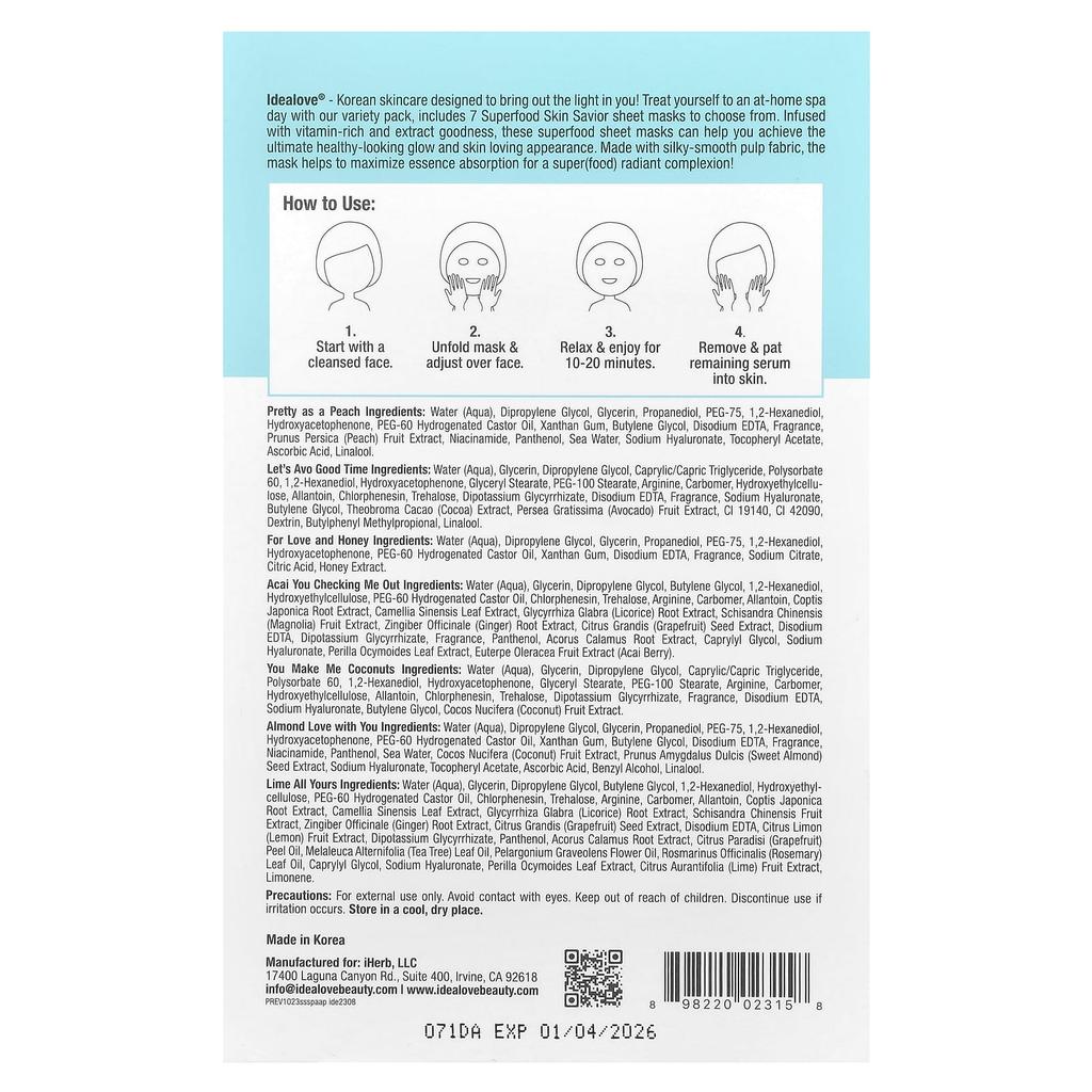Idealove, набор Superfood Skin Savior Variety, 7 косметических тканевых масок, 20 мл (0,68 жидких унций) каждый