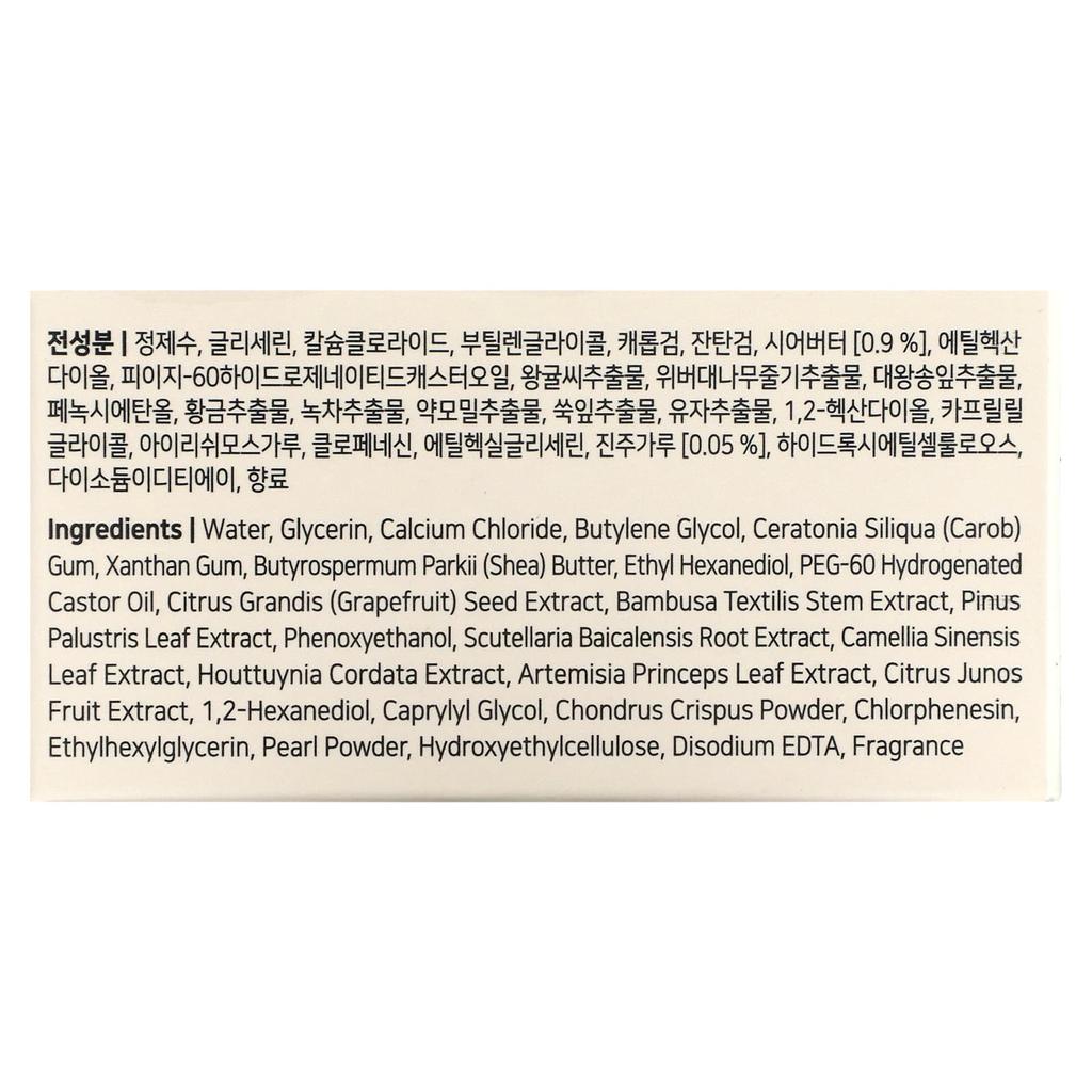 Ингредиенты: Очищенная вода, глицерин, хлорид кальция, бутиленгликоль, камедь рожкового дерева, ксантановая камедь, ирландский мох (Хондрус хрустящий) (каррагинан), ши (Butyrospermum parkii) масло (1%), гидроксиэтилцеллюлоза, ПЭГ-60 гидрогенизированное касторовое масло, спирт, жемчужный порошок (0,05%), динатриевая соль ЭДТА, экстракт корня шлемника байкальского, зеленый чай (чайный куст) экстракт листьев, экстракт хауттюйнии сердцевидной, экстракт полыни обыкновенной, экстракт плодов юдзу, 1,2-гександиол, каприлилгликоль, этилгександиол, грейпфрут (Цитрусовые) экстракт семян можжевельника большого, экстракт стебля бамбука текстилис, экстракт листьев сосны болотной, хлорфенезин, феноксиэтанол, метилпарабен, отдушка.