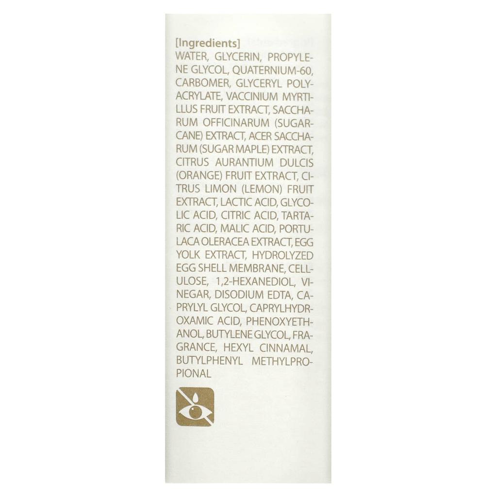 purified water, glycerin, propylene glycol, quaternium-60, carbomer, glyceryl polyacrylate, bilberry (vaccinium myrtillus) fruit extract, sugar cane (saccharum officinarum) extract, sugar maple (acer saccharum) extract, orange (citrus aurantium dulcis) fruit extract, lemon (citrus limon) fruit extract, lactic acid, glycolic acid, citric acid, tartaric acid, malic acid, purslane (portulaca oleracea) extract, egg yolk extract, hydrolyzed egg shell membrane, cellulose, 1,2-hexanediol, vinegar, disodium edta, caprylyl glycol lycol, caprylic hydroxamic acid, phenoxyethanol, butylene glycol, fragrance, hexylcinnamal, butylphenylmethylpropional.