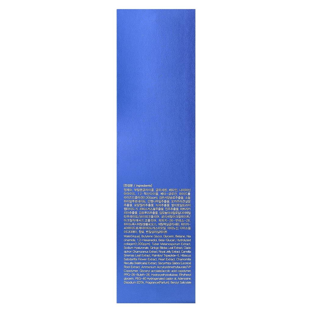 purified water, butylene glycol, glycerin, betaine, niacinamide, 1,2-hexanediol, beta-glucan, hydrolyzed collagen (1,000ppm), black truffle (tuber melanosporum) extract, sodium hyaluronate nate, ginkgo biloba leaf extract, okamura moss (cladosiphon) okamuranus) extract, royal jelly extract, green tea (camellia sinensis) extract, palmitoyl tripeptide-5, hibiscus (hibiscus sabdariffa) flower extract, pearl extract, matricaria (chamomilla recutita) extract, licorice (glycyrrhiza glabra) root extract, ammonium acryloyl dimethyl taurate/vp copolymer, glyceryl acrylate/acrylic acid copolymer, ppg-26-buteth-26, hydroxyethyl cellulose, ethylhexyl glycerin, peg-40 hydrogenated caster oil, adenosine, disodium edta, fragrance, benzyl salicylate.