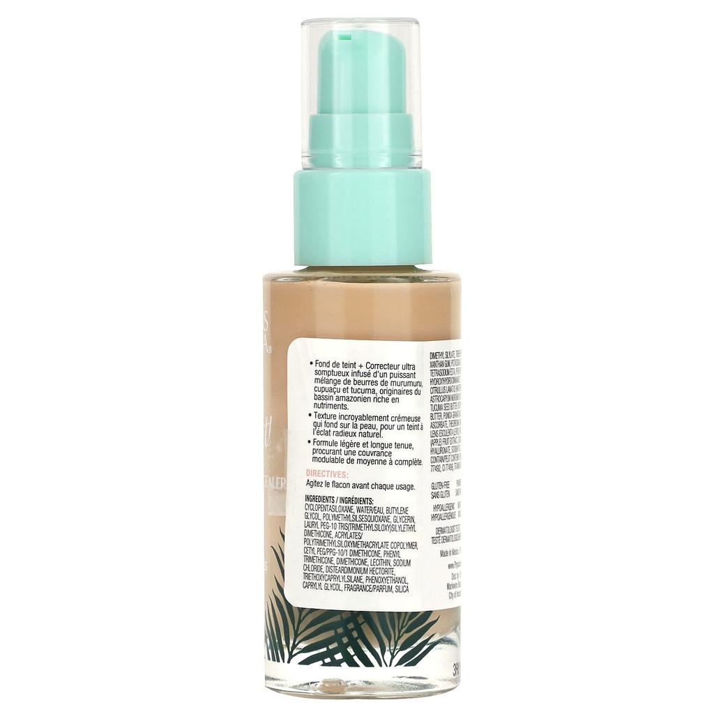 Ингредиенты: Циклопентасилоксан, очищенная вода/вода, бутиленгликоль, полиметилсилсесквиоксан, глицерин, лаурил ПЭГ-10 трис(триметилсилокси)силилэтилдиметикон, акрилат/политриметилсилоксан, сополимер циметакрилата, цетил ПЭГ/ППГ-10/1 диметикон, фенилтриметикон, диметикон, лецитин, хлорид натрия, дистеадимония гекторит, триэтоксикаприлилсилан, феноксиэтанол, каприлилгликоль, отдушка, диоксид кремния, диметилсилилат, трибегенин, гуммиарабик (Акация сенегальская) Камедь, ксантановая камедь, сорбат калия, гексиленгликоль, тетранатрий ЭДТА, пентаэритритил тетра-ди-бутилгидроксигидроциннамат, токоферола ацетат, арбуз (цитруллус ланатус) экстракт семян, пальма (Астрокарий мурумуру) масло из семян, тукума (Астрокариум тукума) масло семян, ши (Butyrospermum parkii) масло, Гранат (Punica granatum) стерол, тетрагексилдецил аскорбат, масло семян Theobroma grandiflorum, экстракт плодов Lens esculenta, экстракт яблока, лактат натрия, гиалуронат натрия, натрий PCA, бензоат натрия. Может содержать: оксид железа (CI77491, CI77492, CI 77499), оксид титана (CI 77891).