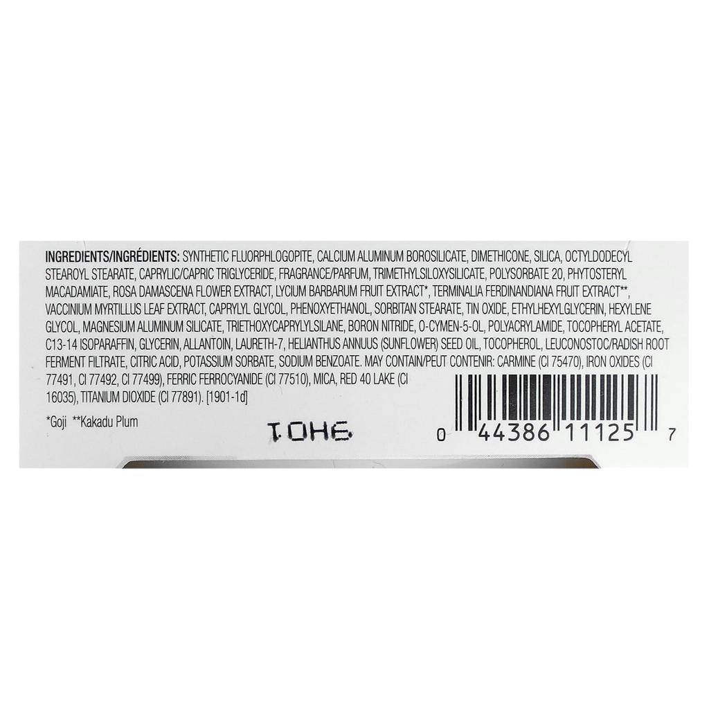 synthetic fluorophlogopite, calcium aluminum borosilicate, dimethicone, silica, octyldodecyl stearoyl stearate, caprylic/capric triglyceride, fragrance, trimethylsiloxysilicate, polysorbate 20, phytosteryl macadamiate, rosa damascena flower extract, lycium barbarum fruit extract*, kakadu plum (terminalia ferdinandiana) fruit extract** bilberry (vaccinium myrtillus) leaf extract, caprylyl glycol, phenoxyethanol, sorbitan stearate, tin oxide, ethylhexyl glycerin, hexylene glycol lycol, magnesium aluminum silicate, triethoxycaprylyl silane, boron nitride, o-cymen-5-ol, polyacrylamide, tocopheryl acetate, c13-14 isoparaffin, glycerin, allantonin, laureth-7, sunflower (helianthus annuus) seed oil, tocopherol, leuconostoc/non-fermentation filtration. water, citric acid, potassium sorbate, sodium benzoate. may contain: carmine (ci75470), iron oxide (ci 77491, ci77492, ci77499), ferric ferrocyanide (ci77510), mica, red no. 40 aluminum lake (ci16035), titanium dioxide (ci77891). *goji berry **kakadu plum