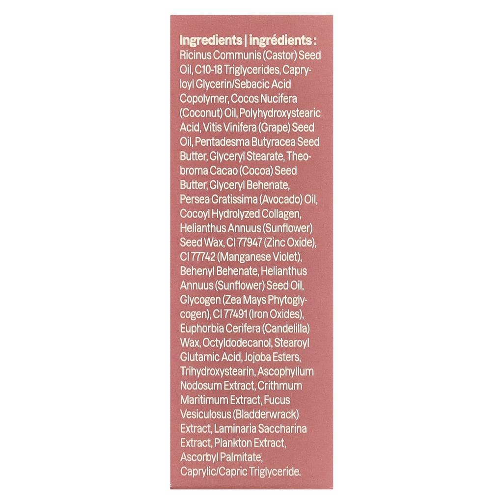 castor (ricinus communis) seed oil, c10-18 triglyceride, capryloyl glycerin/sebacic acid copolymer, coconut (cocos nucifera) oil, polyhydroxystearic acid, grape (vitis vinifera) seed oil, penta demabutyracea seed butter, glyceryl stearate, cacao (theobroma cacao) seed butter, glyceryl behenate, avocado (persea gratissima) oil, cocoyl hydrolyzed collagen, sunflower (helianthus annuus) seed wax, ci77947 (zinc oxide), ci 77742 (manganese violet), behenyl behe nate, sunflower (helianthus annuus) seed oil, glycogen (zea mays) phytoglycogen), ci77491 (iron oxide), candelilla (euphorbia cerifera) wax, octyldodecanol, stearoyl glutamic acid, jojoba ester, trihydroxystearin, kelp (ascophyllum nodosum) extract, rock samphire extract, bladderwrack (fucus vesiculosus) ) extract, sugar kelp (laminaria) saccharina) extract, plankton extract, ascorbyl palmitate, caprylic/capric triglyceride.