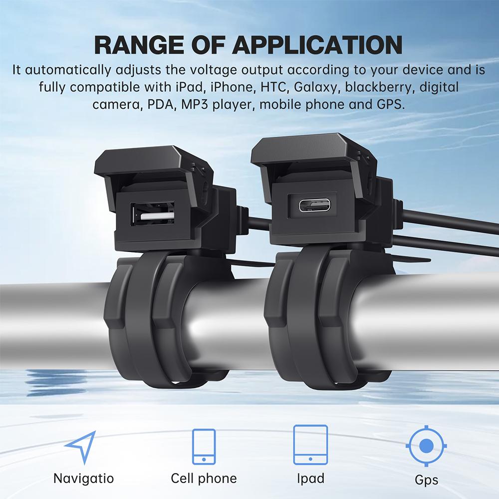 Широкая совместимость. Входное напряжение USB-зарядного устройства мотоцикла составляет (12V-24V). Он может автоматически регулировать выходное напряжение в соответствии с вашим устройством (USB-A: 5В/3.4A, 9V/2.5A, 12V/1.5A TYPE-C: 5В/3А 9В/3А 12В/2.5А), полная совместимость с iPad, iPhone, iPod, HTC, Galaxy, Blackberry, цифровыми камерами, КПК, MP3-плеерами, мобильными телефонами и GPS