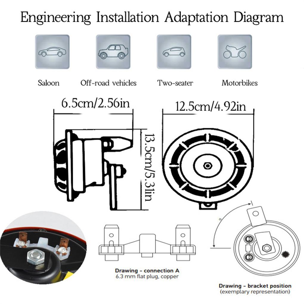 Характеристики: Автомобильный электрический гудок имеет выходную частоту: высокие 400 Гц и басы 335 Гц, диаметр 4,84 дюйма, рабочий ток 3 А, низкие