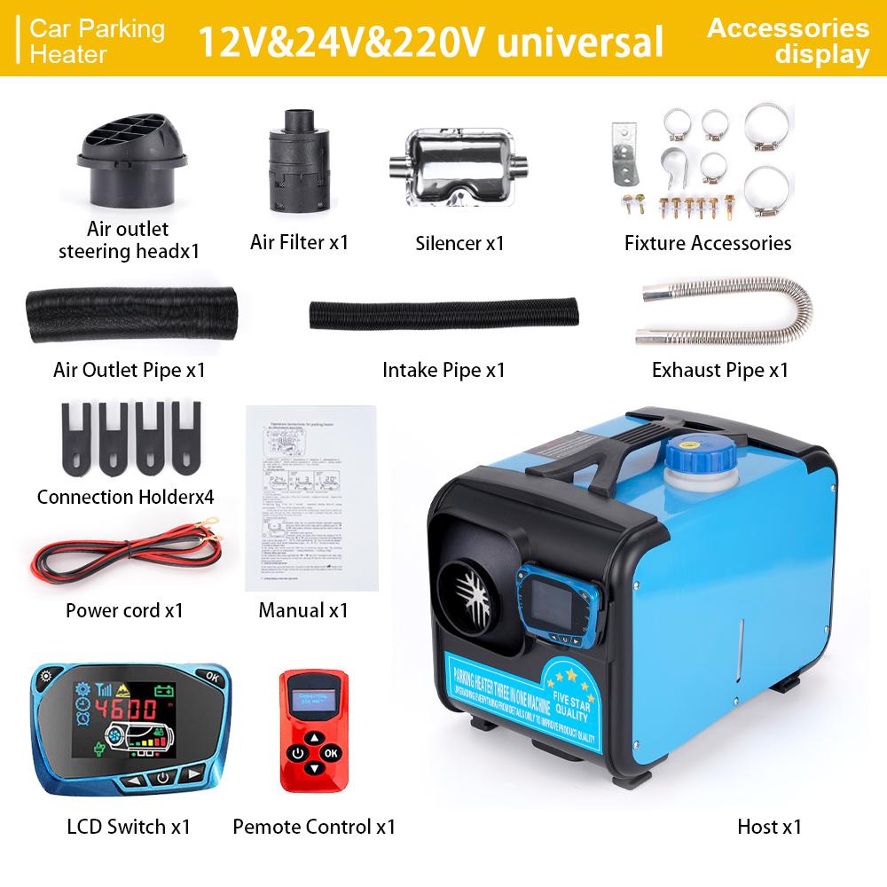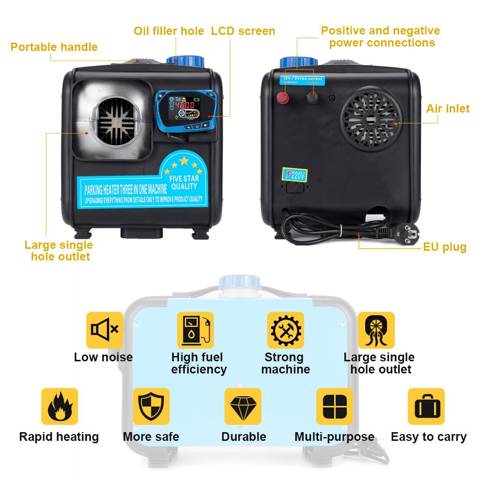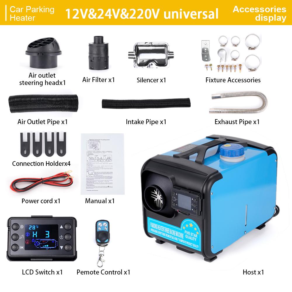 Многоцелевой стояночный дизельный обогреватель: Можно использовать во всех видах автомобилей, грузовиков, рабочих транспортных средств, кораблей, в помещениях, домах, рабочих мастерских и т. д., а также в тепле в холодную зиму. Это модернизированный универсальный аккумулятор с тремя видами напряжения 12 В, 24 В, 220 В.