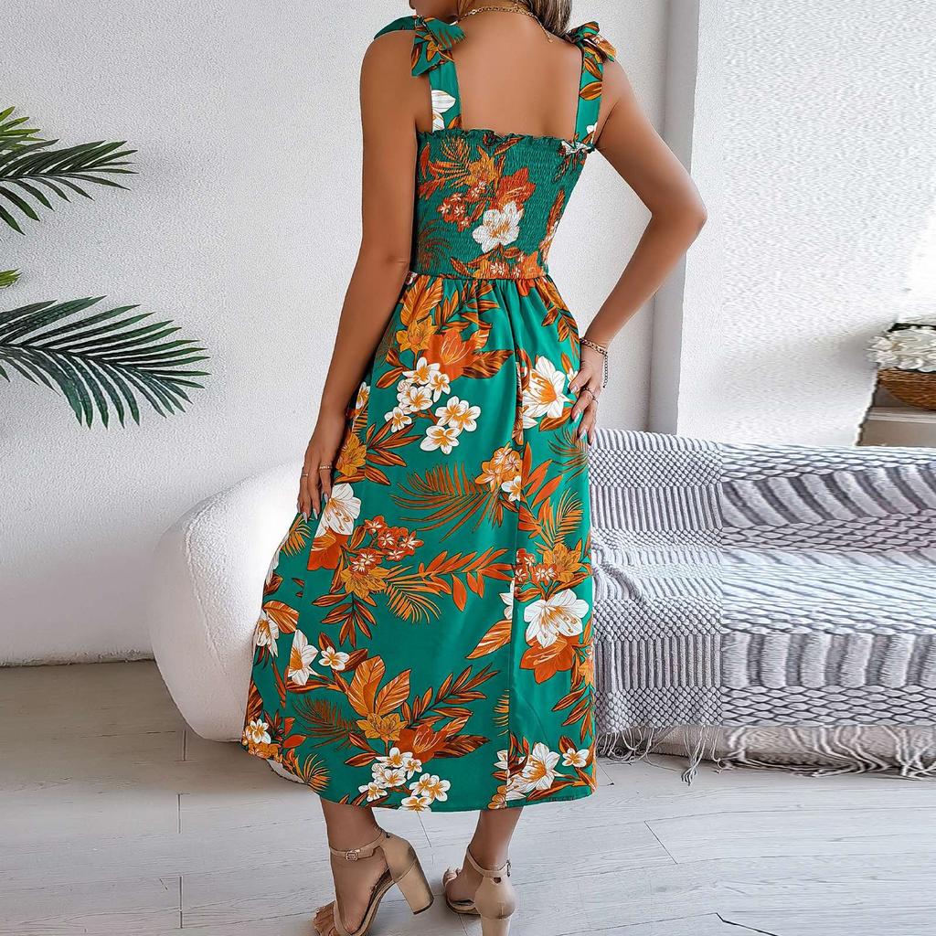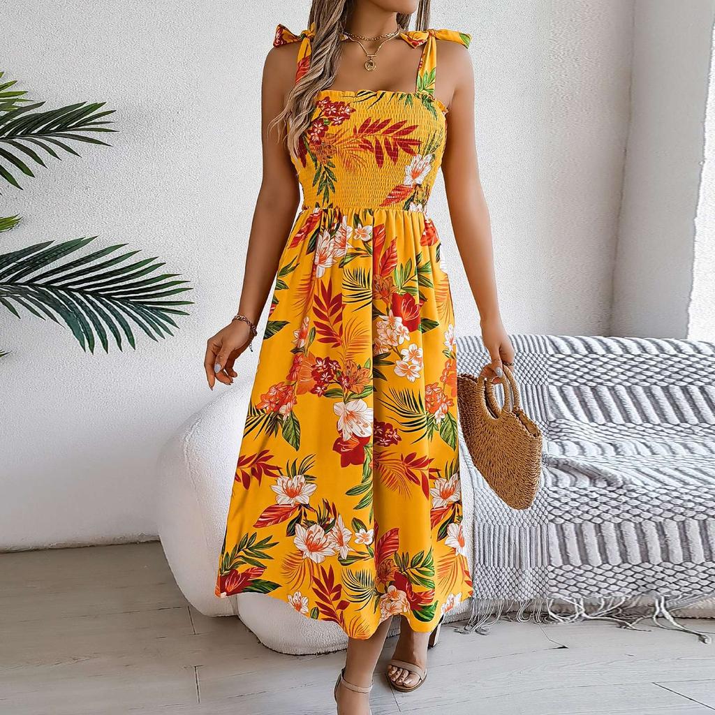 Женское модное платье с цветочным принтом и подтяжками, пляжное платье макси для отдыха