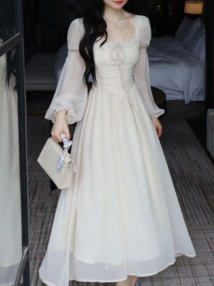 2024 Новая французская длинная юбка темперамент квадратный вырез шифон длинный рукав сказочный дворец ветер платье ранняя весна — купить товар онлайн с бесплатной доставкой по всему миру!
