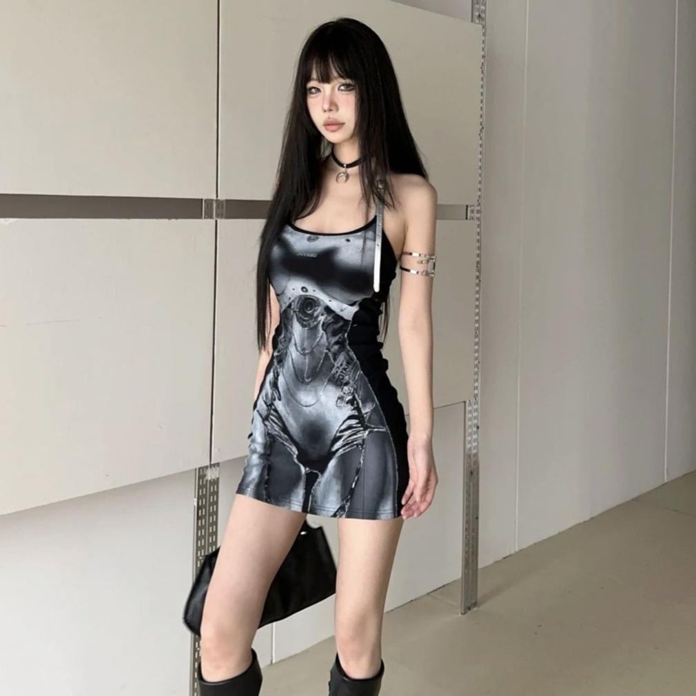 Платье-майка без рукавов Женское панк-халат Винтажный принт Harajuku Мини Эстетика Y2k Базовые платья-карандаш Лето