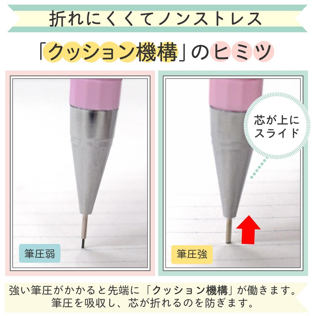 ・[Особенности] Использует «амортизирующий механизм» на кончике направляющей (часть, где свинец выходит), который поглощает давление пера и предотвращает поломку грифеля.