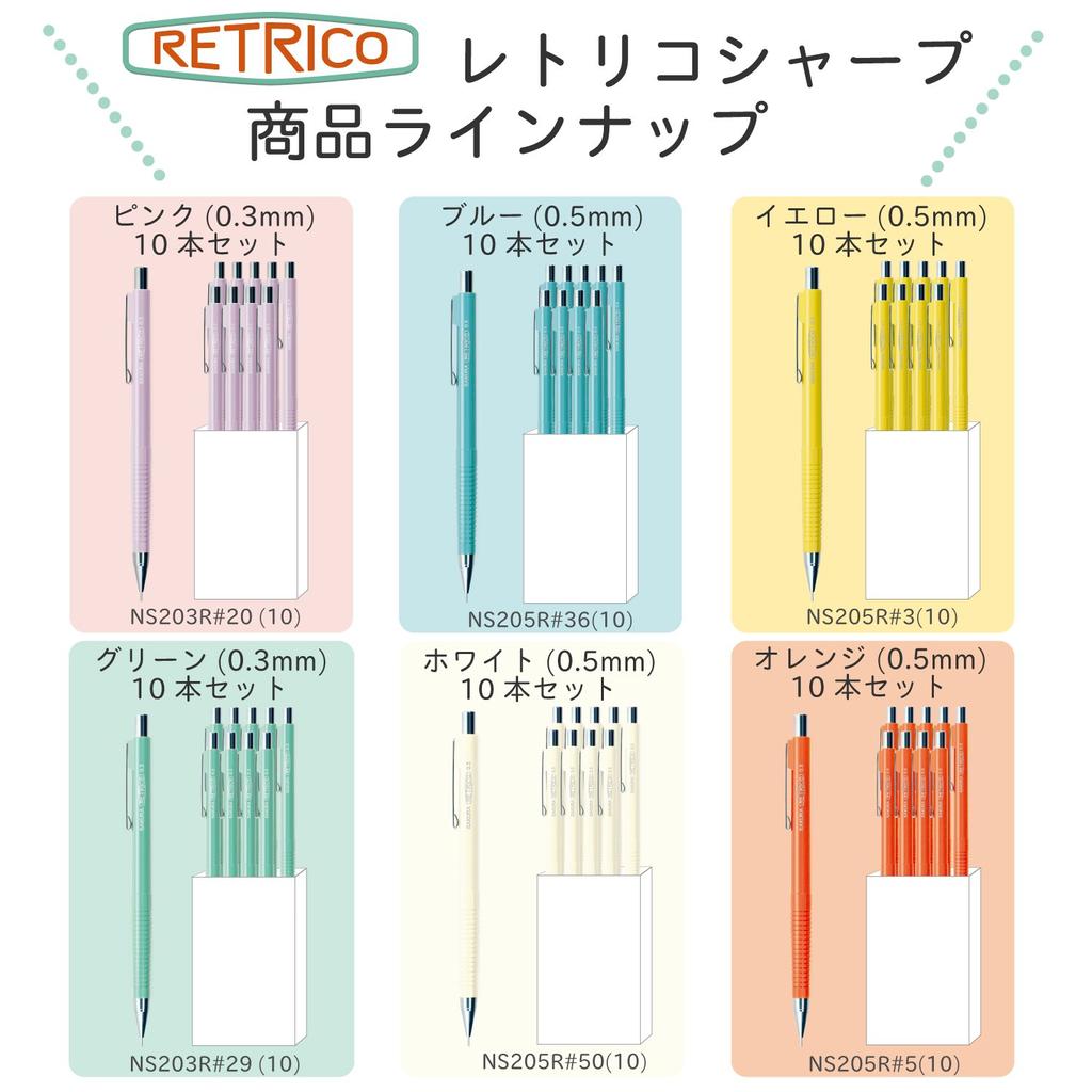 Цветной механический карандаш с ретро-дизайном, 2 ширины линии, 6 цветов. Розовый, зеленый (0.3mm), белый, синий, желтый, оранжевый (0.5mm).