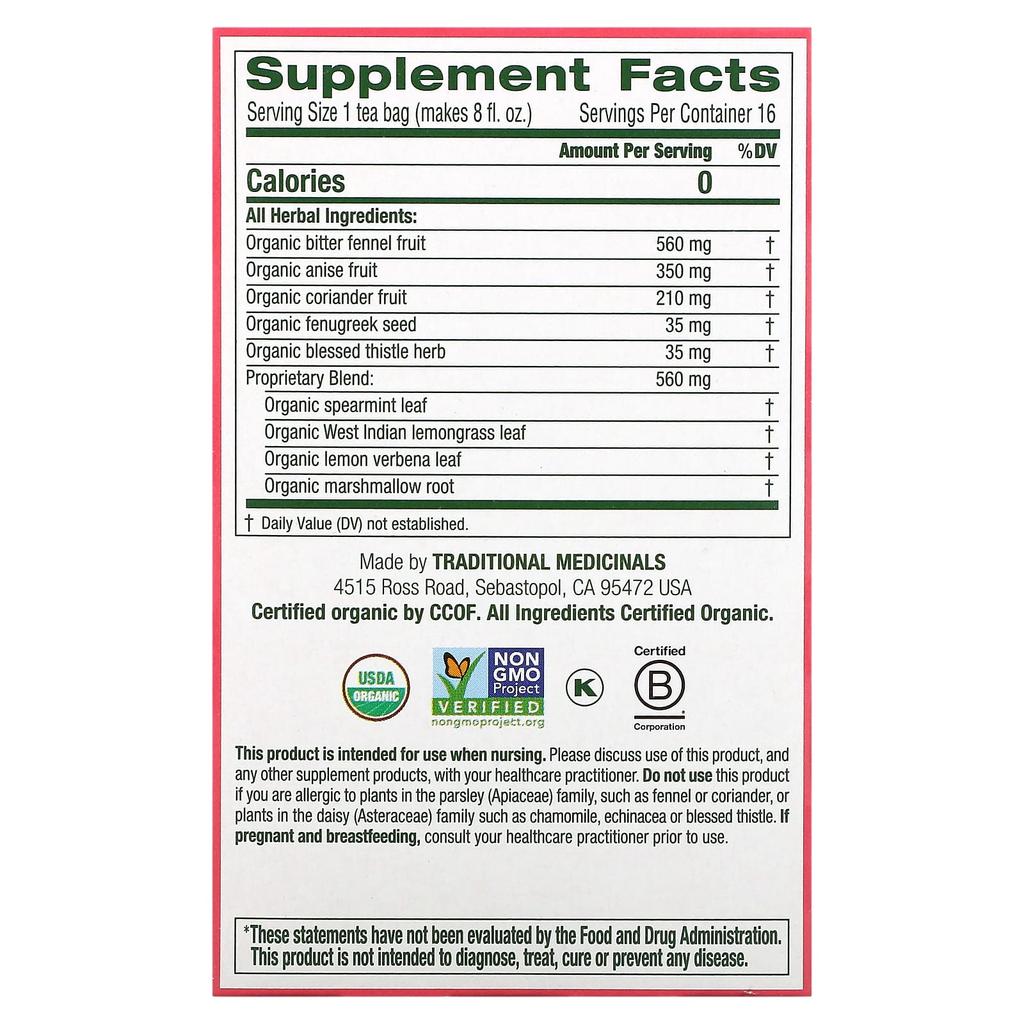 Описание товара: Женское здоровьеТравяная добавка для здорового грудного вскармливанияСертификация USDA OrganicСертификация CCOF OrganicСертификация Non-GMO ProjectКошерныйB Corp. Сертифицированные преимущества травПомогает стимулировать выработку грудного молока у кормящих матерей. Вкус сладкий с отчетливым привкусом солодки. История растения Вдохновленная традиционными европейскими лекарственными комбинациями, передаваемыми женщинами из поколения в поколение, наша проверенная временем формула содержит фенхель. , Анис, кориандр, пажитник и чертополох используются для стимуляции лактации.. Уже более 40 лет матери доверяют этому чаю кормление своих малышей.Травы, приносящие пользуМы стремимся использовать пользу этих удивительных растений в наших чаях на каждом этапе пути — от выращивания до подачи на стол.. Чтобы обеспечить неизменно высокое качество чая, мы используем органически выращенные или собранные в дикой природе травы от этичных торговых партнеров, которые стремятся получить продукцию медицинского назначения.. В мире существует лишь несколько источников трав, которые соответствуют нашим высоким стандартам качества.