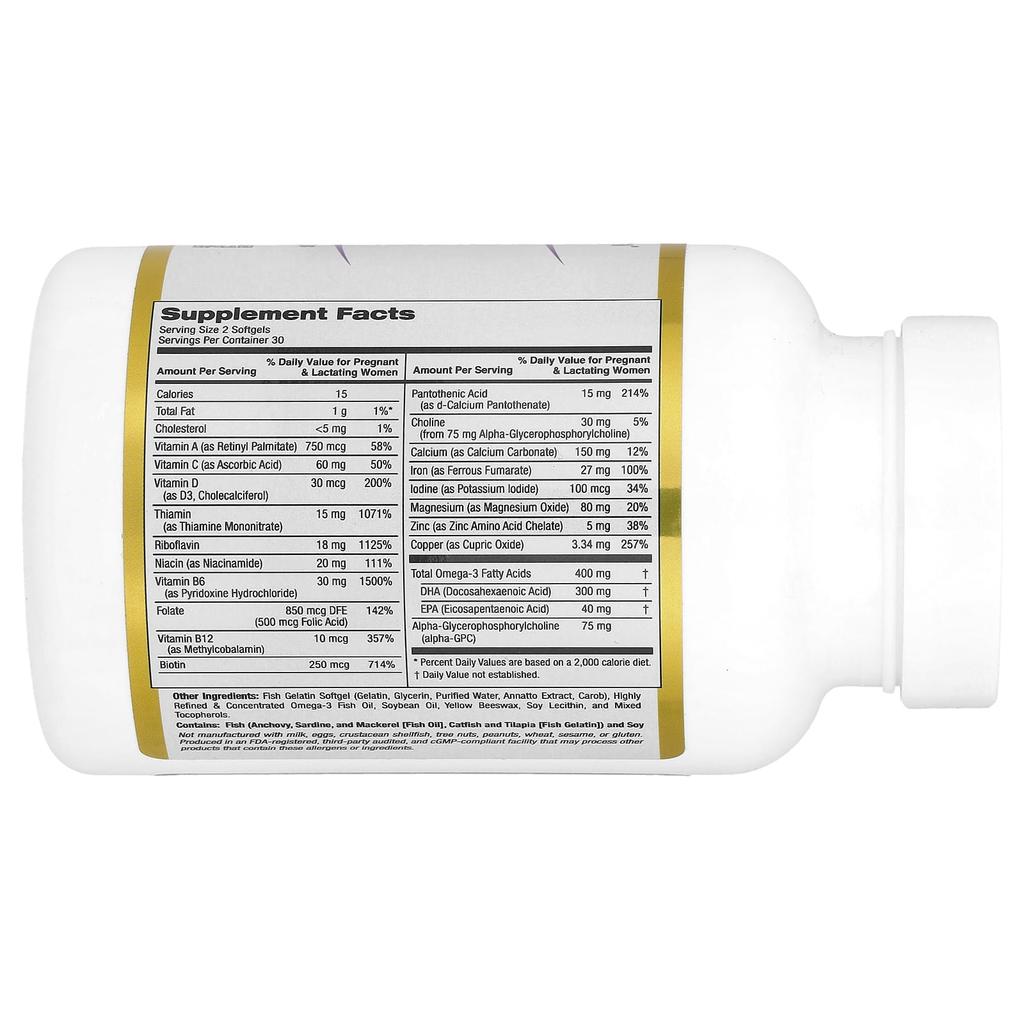 ингредиенты: Основные ингредиенты Витамин А (ретинилпальмитат), Витамин С (аскорбиновая кислота), Витамин Д (D3, холекальциферол), тиамин (мононитрат тиамина), рибофлавин, ниацин (ниацинамид), витамин В6 ( Пиридоксина гидрохлорид), фолиевая кислота, витамин B12 (метилкобаламин), биотин, пантотеновая кислота (кальций d-пантотенат), холин (извлечено из 75 мг альфа-глицерофосфорилхолина), кальций (карбонат кальция), железо (фумарат железа), йод (йодистый калий), магний (оксид магния), цинк (аминокислота цинка) хелаты), медь (оксид меди), смесь альфа и омегаДругие ингредиентыВысокоочищенный продукт концентрированный рыбий жир омега-3, Мягкая капсула (рыбный желатин, глицерин, очищенная вода, экстракт аннато, рожковое дерево), соевое масло, пчелиный воск, соевый лецитин, смесь токоферолов. Ингредиенты: Рыбы (анчоус, сардина, скумбрия [рыбий жир], сом, тилапия [рыбный желатин]) ]), Соя Альфа и Омега™. Alpha and Omega™ являются зарегистрированными товарными знаками KD Nutra. Этот продукт не производится из молока, яиц, моллюсков, орехов, арахиса, пшеницы, семян кунжута или глютена.. Произведено на сертифицированном cGMP предприятии, где обрабатываются другие продукты, содержащие эти аллергены или вещества.