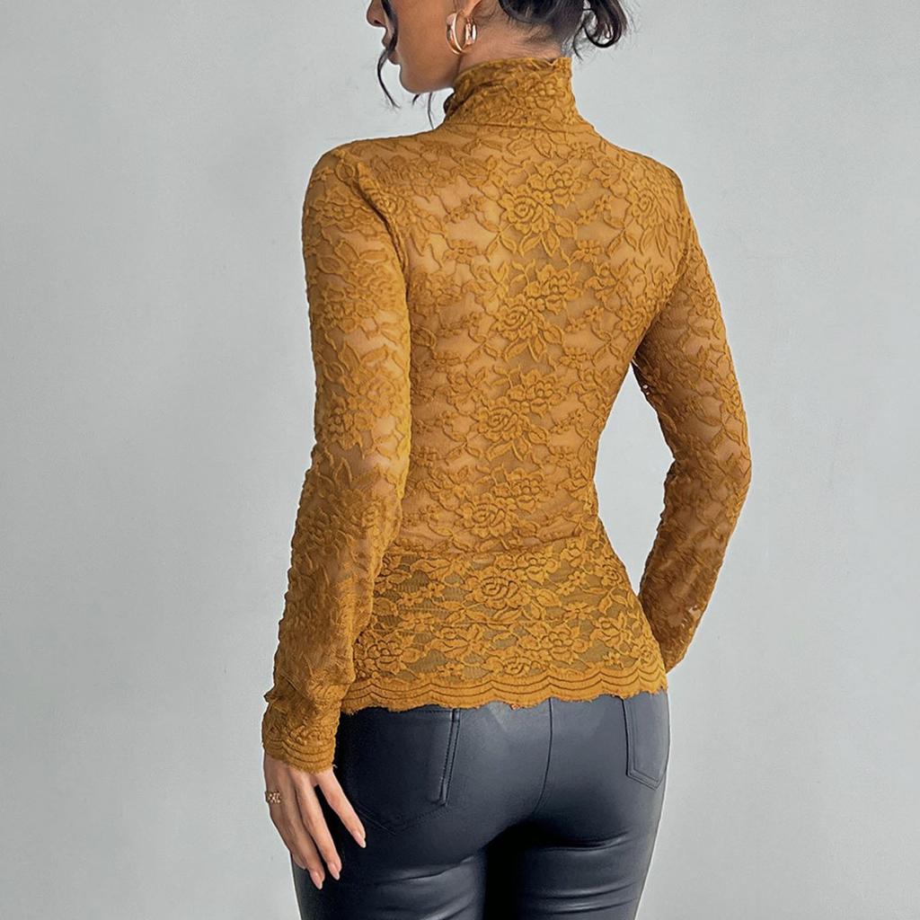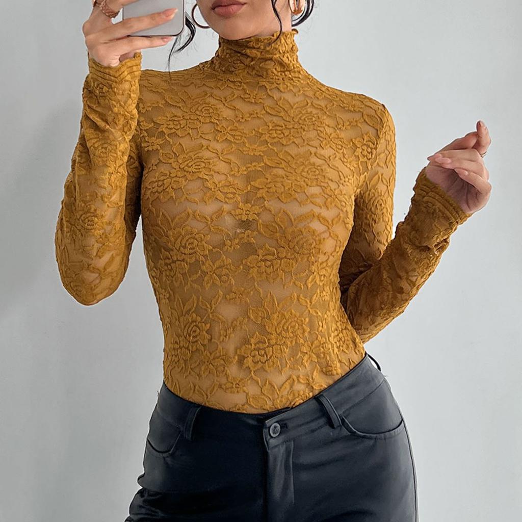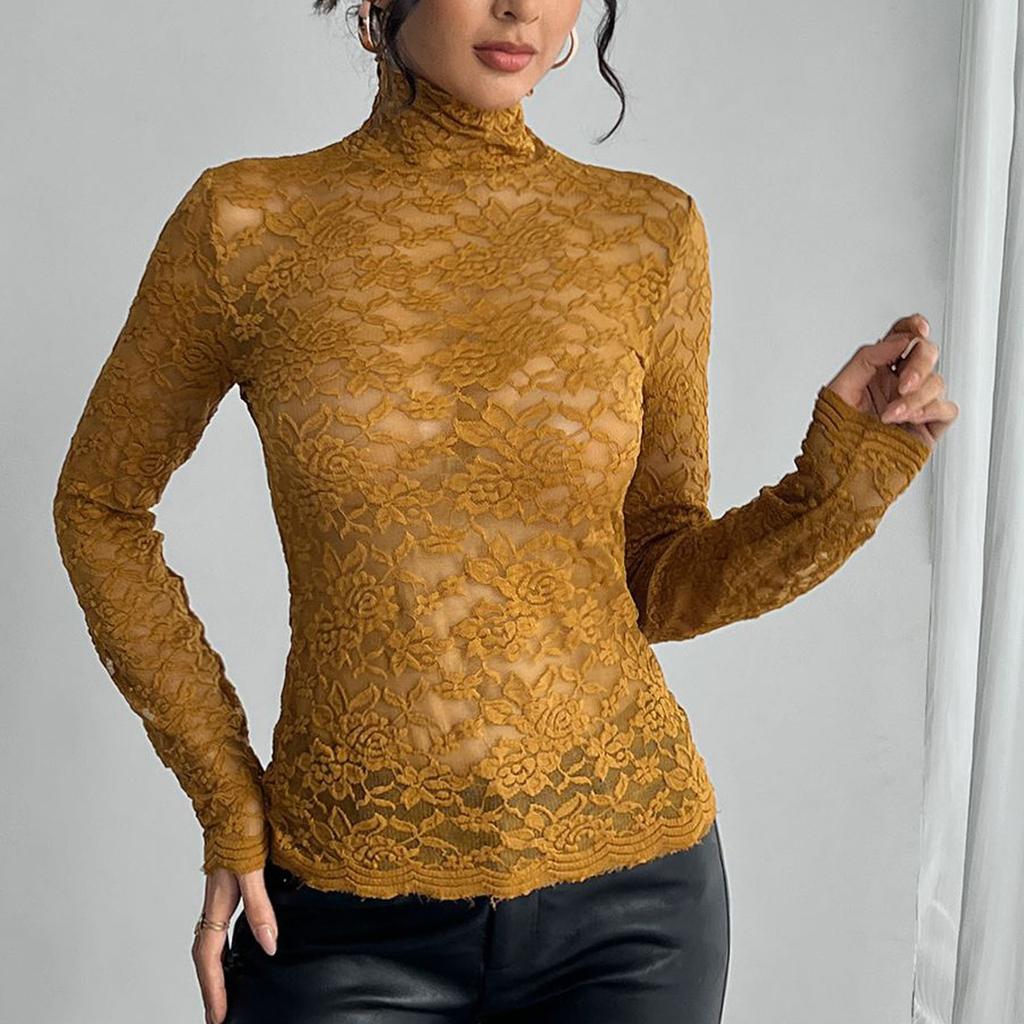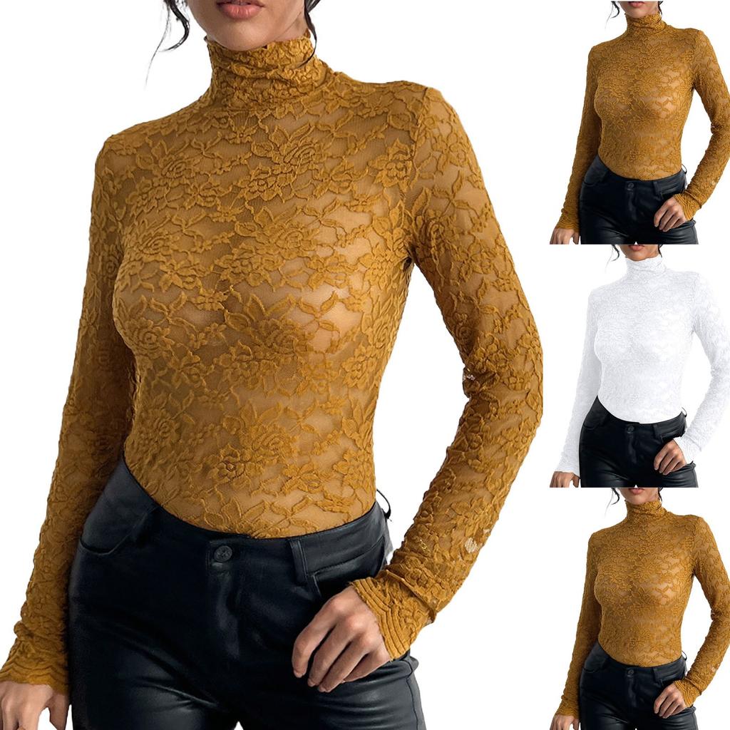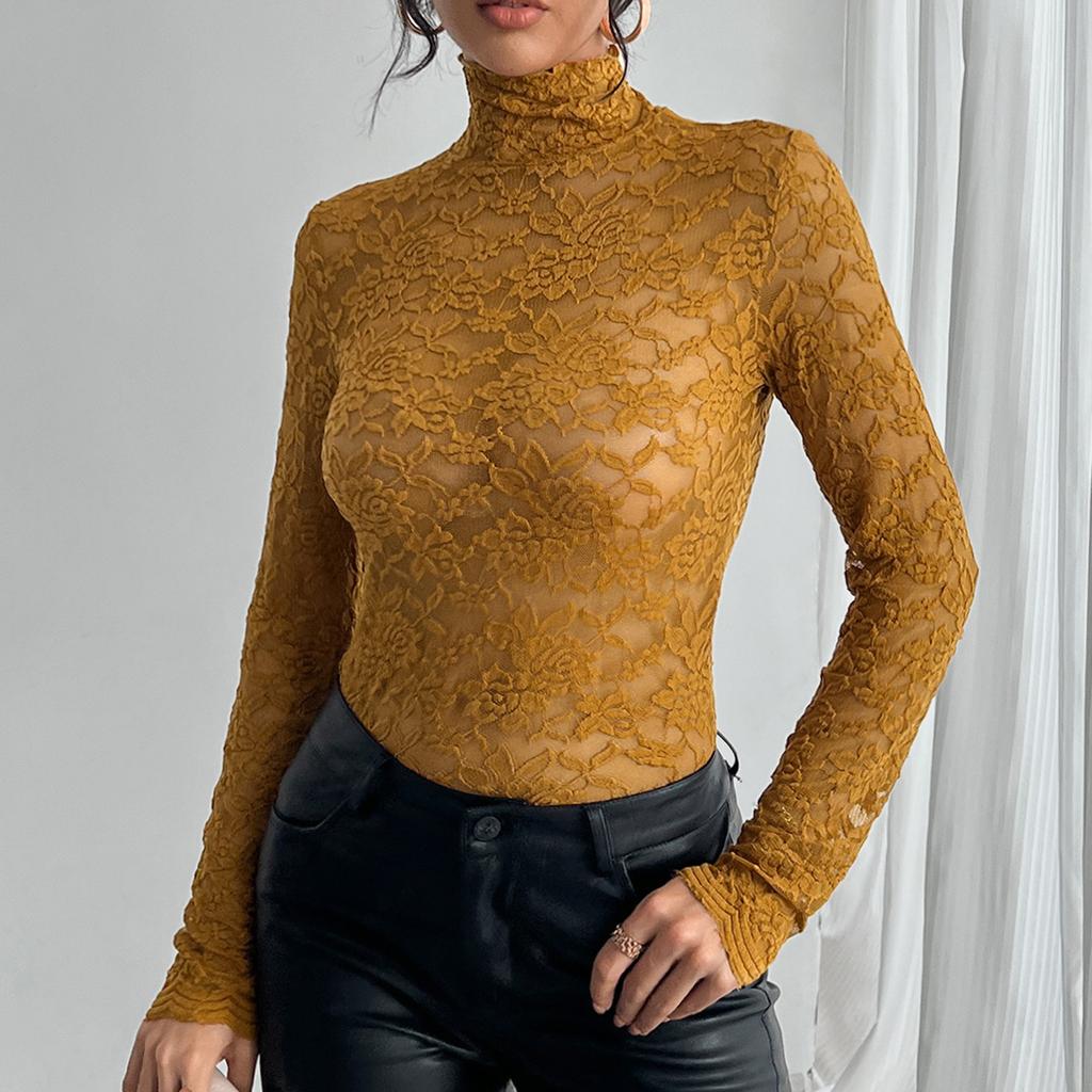 Женская однотонная кружевная рубашка с длинными рукавами и высоким воротом, базовый маленький топ, базовый маленький топ, базовый маленький топ
