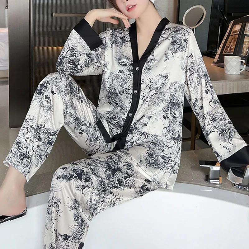 Пижамные комплекты больших размеров, женский кардиган, домашняя одежда, V-образный вырез, рисунок тушью, брюки с длинными рукавами, женская шелковая мягкая одежда для сна, домашняя одежда