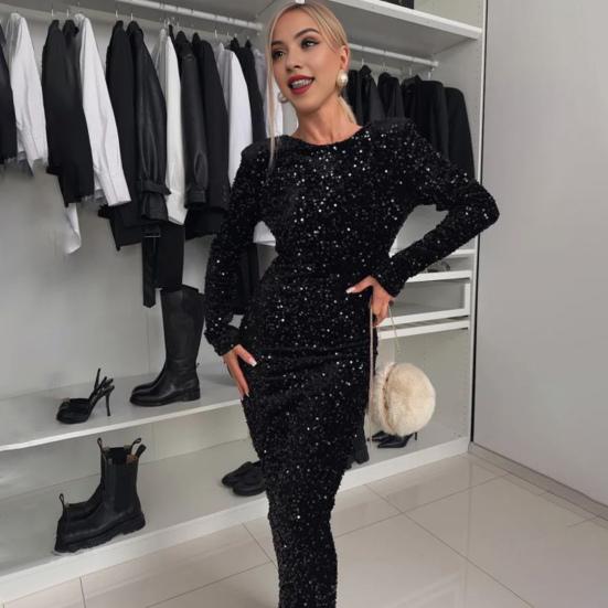 Дополните свой вечерний образ этим элегантным и модным платьем с круглым вырезом и длинными рукавами.. Платье, выполненное из сверкающих пайеток, имеет приталенный силуэт, открытую спину и очаровательный бант.. Идеально подходит для особых случаев, таких как вечеринки, танцы, банкеты и свадьбы..