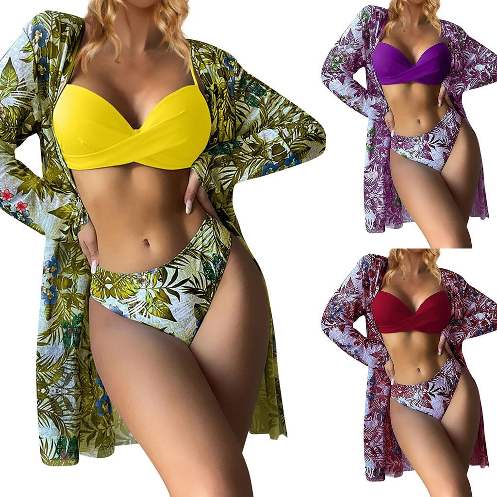 Женский бикини с цветочным принтом, сексуальный быстросохнущий купальник, комплект из 3 предметов — купить товар онлайн с бесплатной доставкой до всему миру!