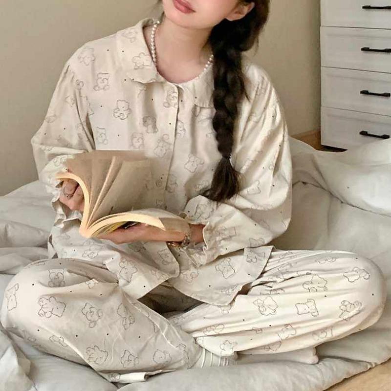 Пижамы женские весна осень пижамы с длинными рукавами и брюками ночная одежда милая свободная домашняя одежда с кукольным воротником и воланами домашняя одежда
