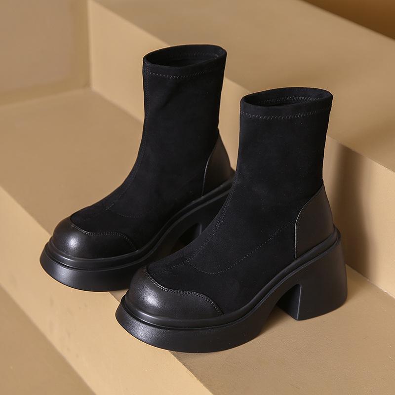 Короткие сапоги женские осень и зима 2024 новые высокие эластичные сапоги тонкие сапоги толстый каблук толстая подошва средние матерчатые сапоги