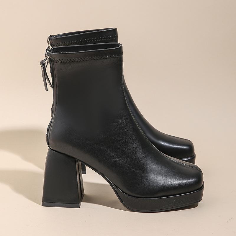 Короткие сапоги женские 2024 осень и зима новые толстые каблуки молния сзади модные сапоги сексуальные завышенные квадратные носы кожаные сапоги большие размеры — купить товар онлайн с бесплатной доставкой до всему миру!