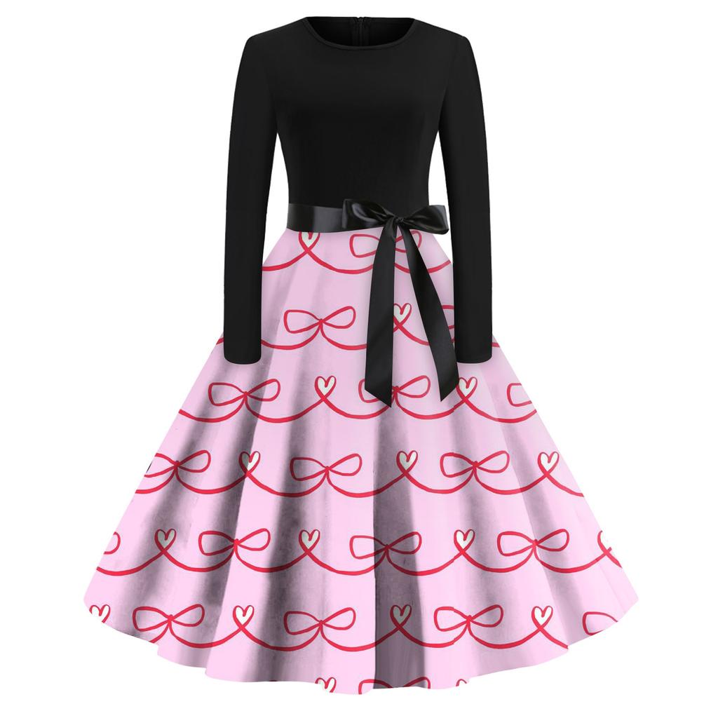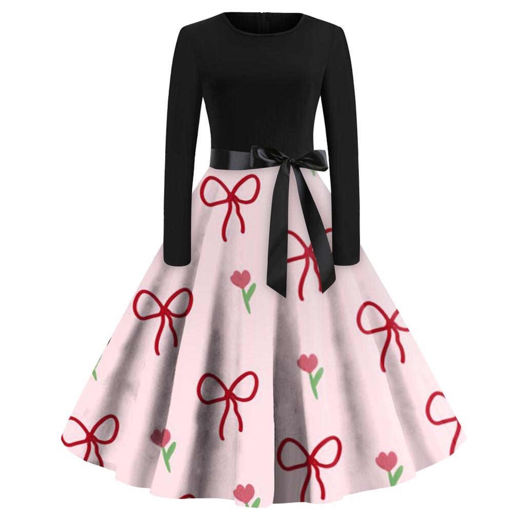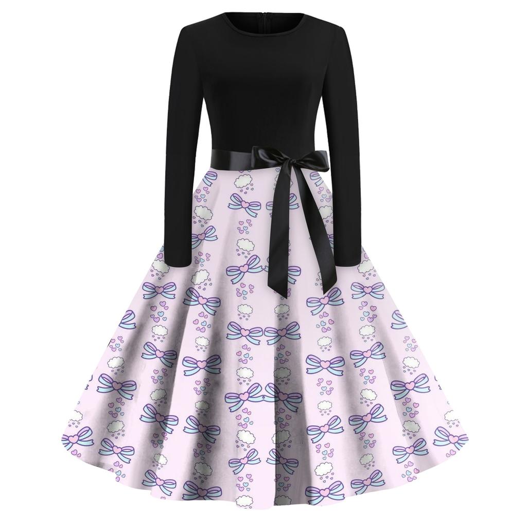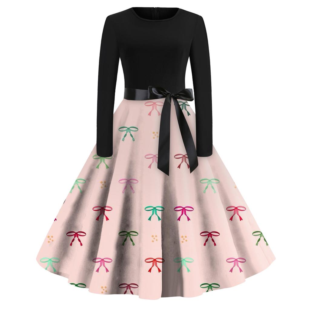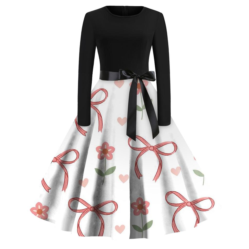 Женское платье с круглым вырезом и большим подолом, плиссированная юбка с длинными рукавами, платье