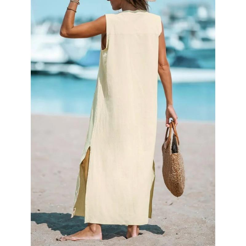 Женское платье из хлопка и льна без рукавов, однотонное, однобортное, свободное, с V-образным вырезом, длинное, повседневное платье