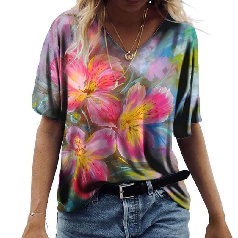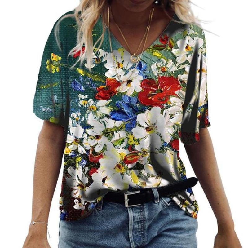 Летние женские футболки с 3d модным цветочным принтом Harajuku, футболки большого размера для женской одежды, новые топы с короткими рукавами и v-образным вырезом