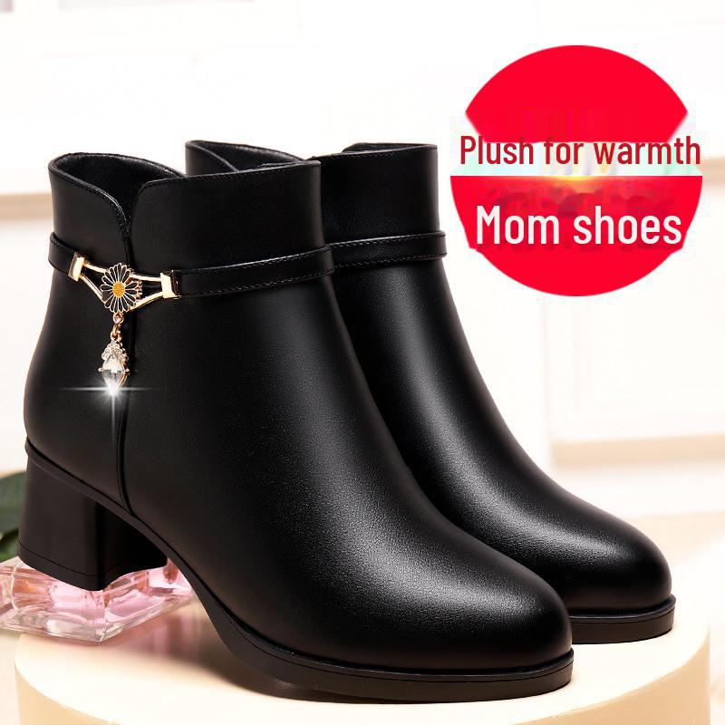 «Женские нескользящие кожаные ботинки на среднем каблуке — осенне-зимняя коллекция с бархатной подкладкой для людей среднего и пожилого возраста»