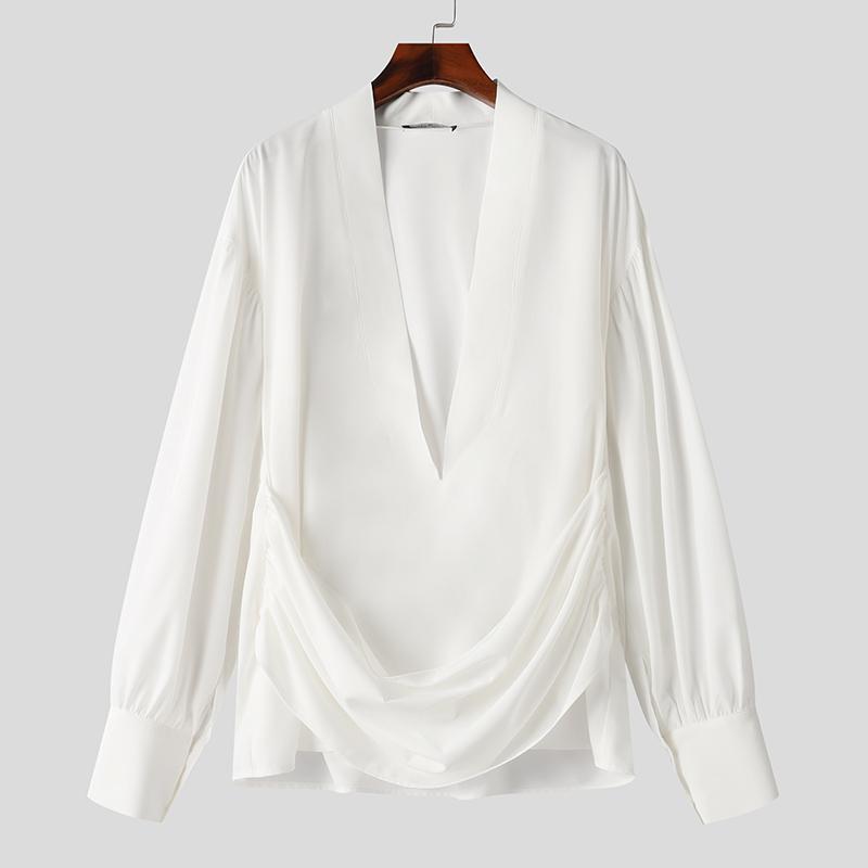 INCERUN Большие размеры Мужские рубашки с глубоким V-образным вырезом, длинными рукавами-фонариками, слегка прозрачными слоями, топы с перекрестными застежками спереди