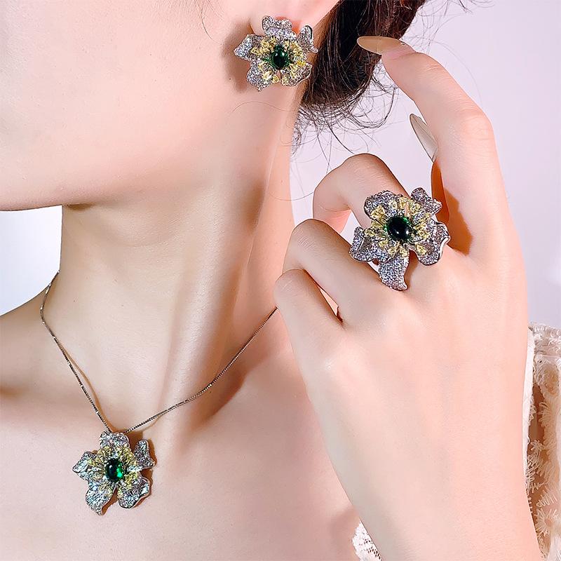 Комплект ювелирных изделий Аксессуары Французские серьги-гвоздики Темпераментные кольца Изумрудные сокровища Ожерелье Премиум Циркон Цветок Женщины
