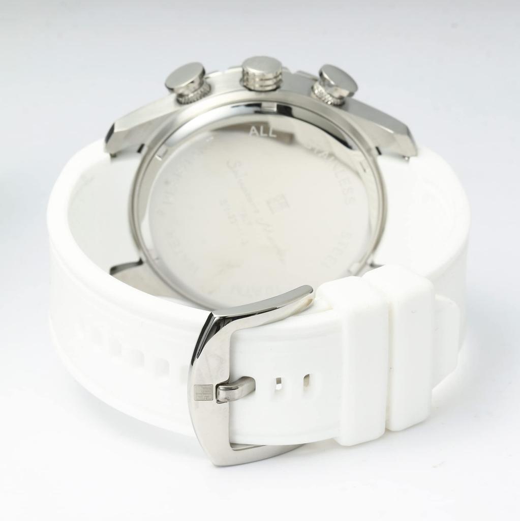 [Подробности о продукте] [Размер] (ок.) В45 x Ш45 x Г12 мм (без учета выступов и короны) Окружность руки максимальная, приблизительно. 20 см, минимум примерно. 15 см [Вес] примерно. 100г [Материал] Чехол: Нержавеющая сталь, ремень: Силиконовая резина [Характеристики] ]Кварц (аккумулятор) / Водонепроницаемость 10 АТМ / Хронограф / Календарь даты / 24-часовой счетчик [Цветной] циферблат: Белый, Пояс: белый