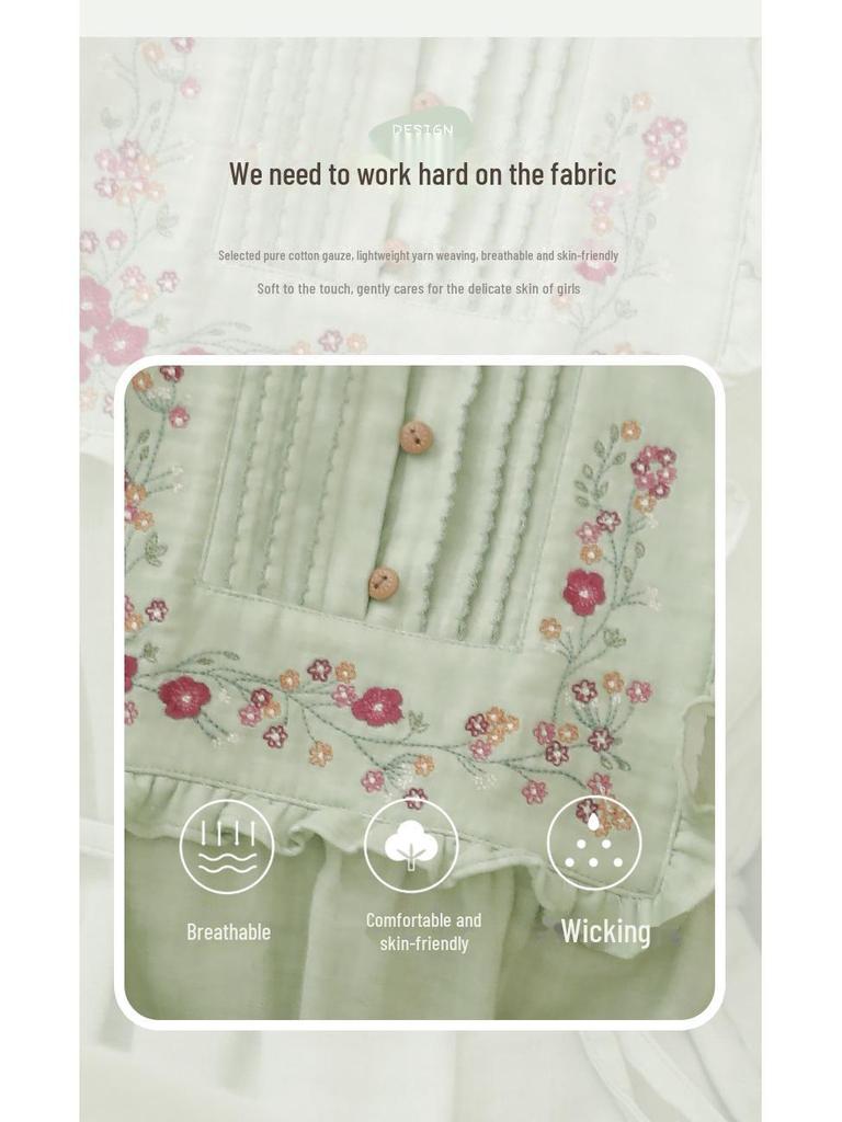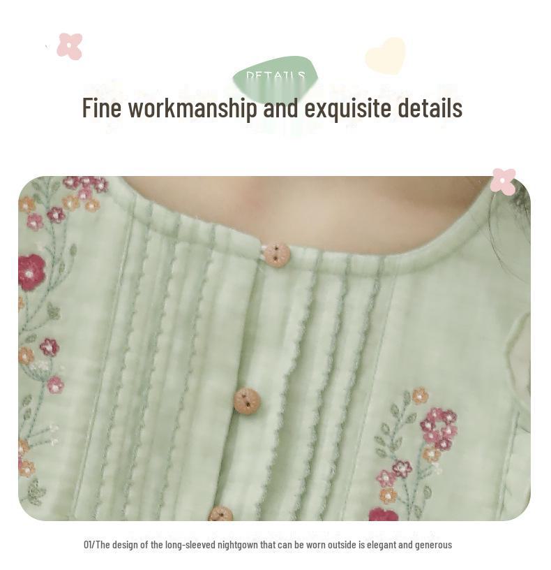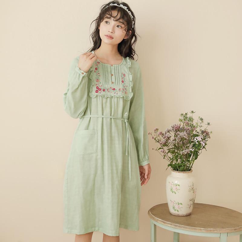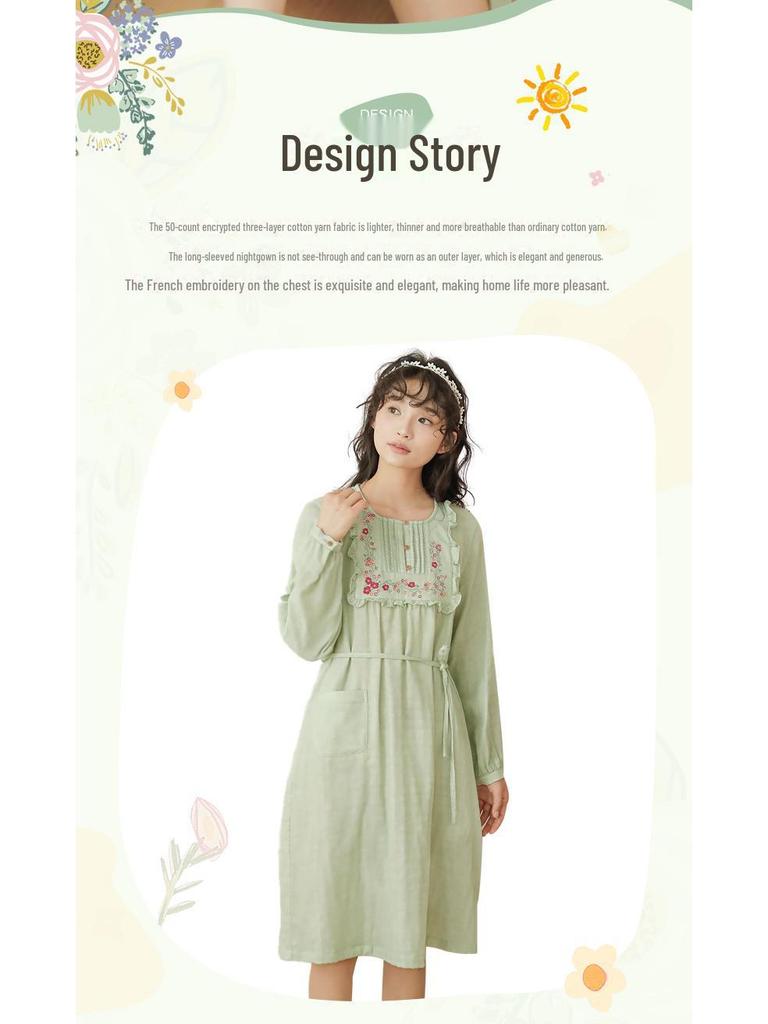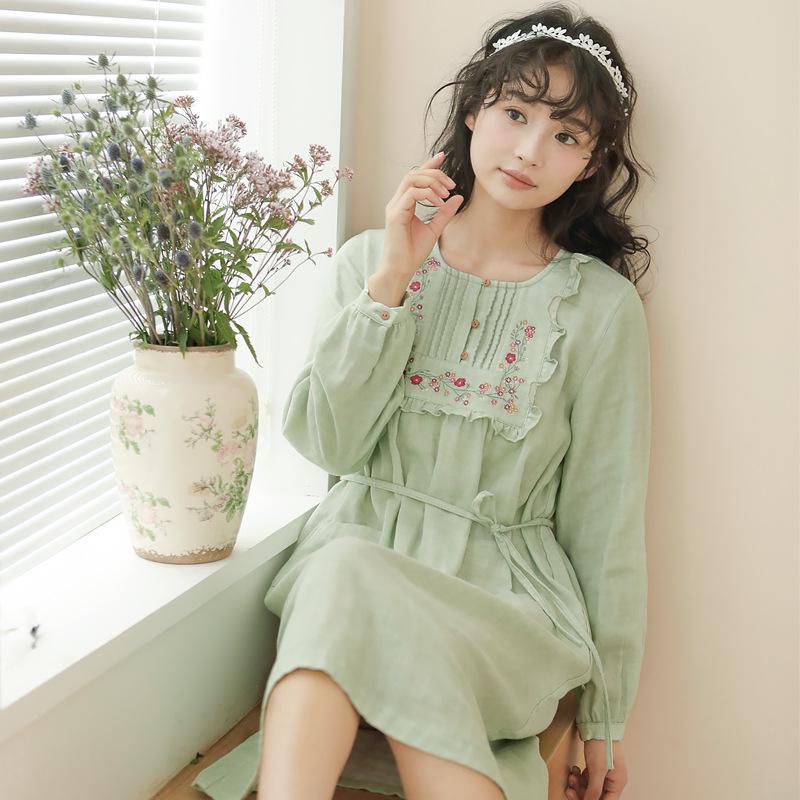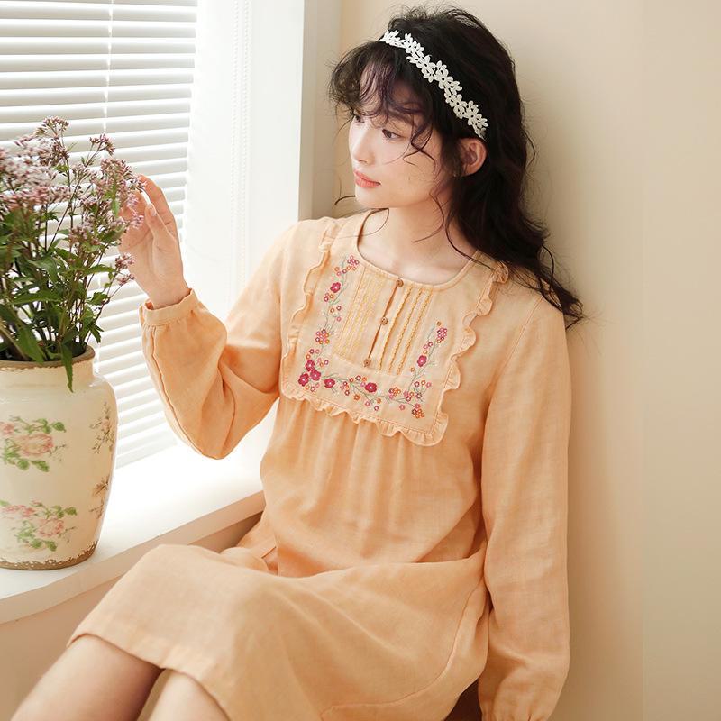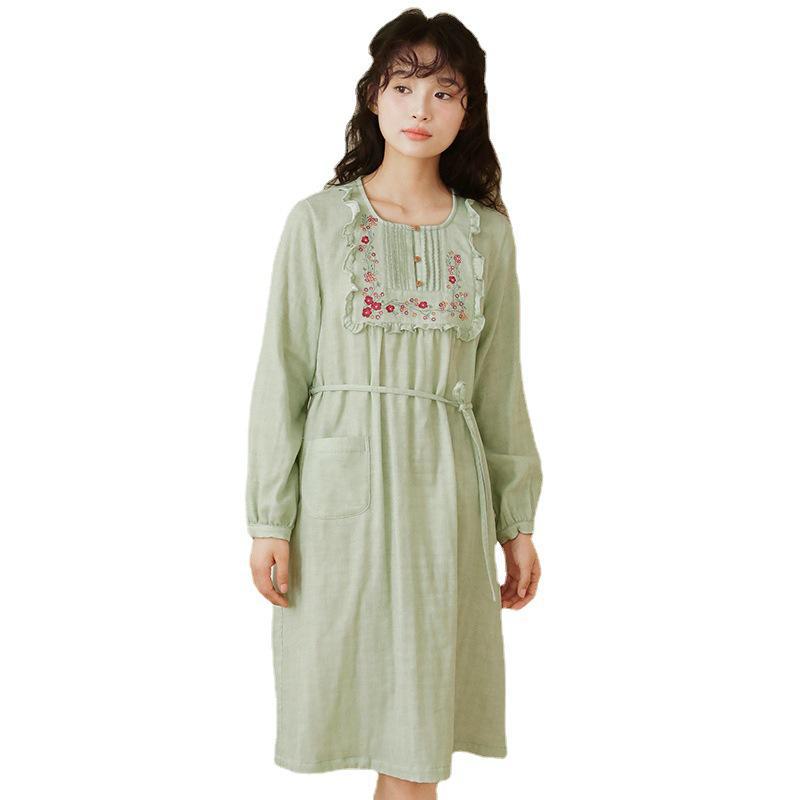 Женская ночная рубашка из хлопка с круглым вырезом и длинными рукавами - удобная дышащая японская одежда для дома весной и летом