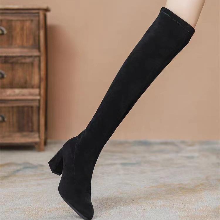 Женские замшевые сапоги выше колена на высоком каблуке с эластичной резинкой, средний каблук, плюс бархат, облегающий крой для миниатюрных