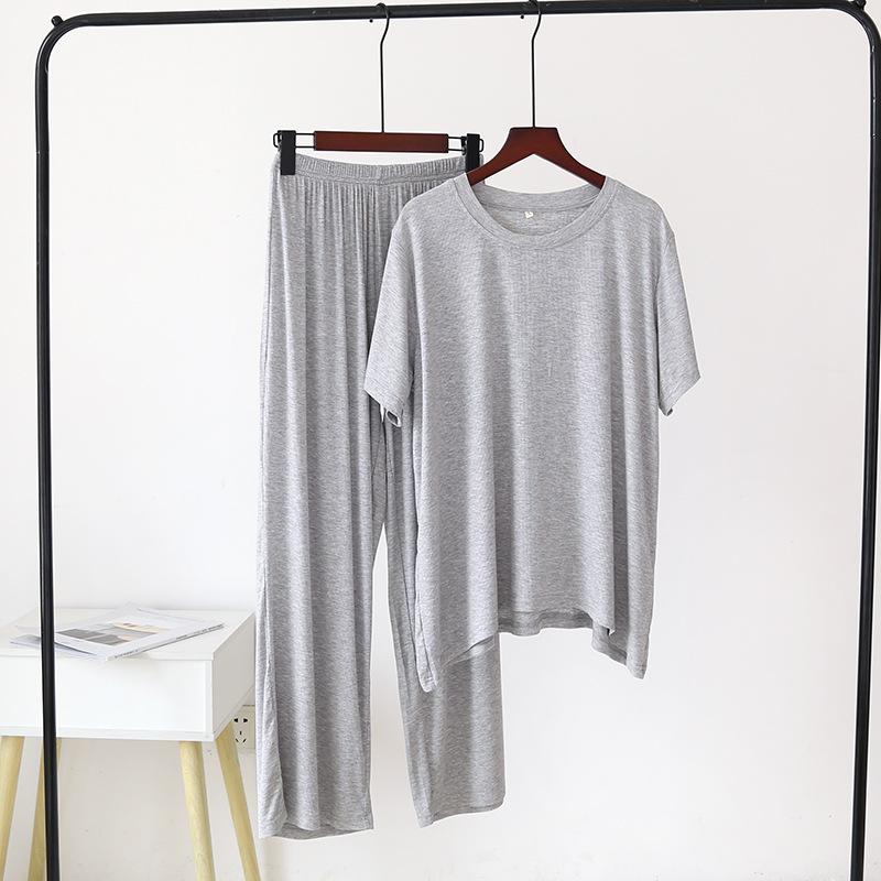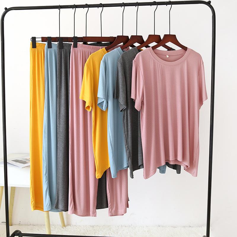 Весна и лето Новая женская пижама с короткими рукавами + брюки из двух частей, модальный тонкий свободный большой размер, однотонный домашний костюм