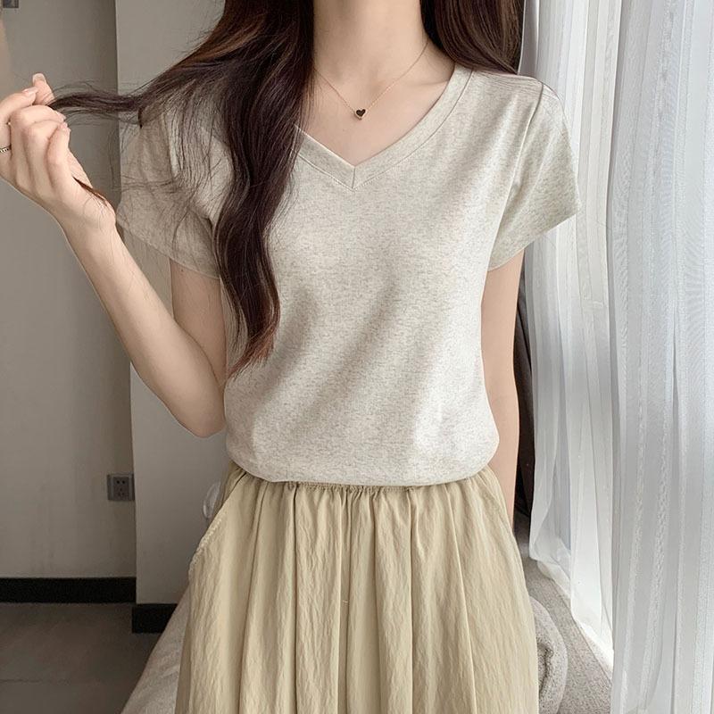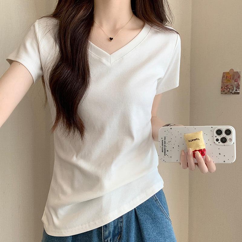 Футболка облегающего кроя из чистого хлопка с V-образным вырезом для женщин, корейский стиль, универсальная, летняя, тонкая, с правым плечом, облегающий верх, короткие рукава