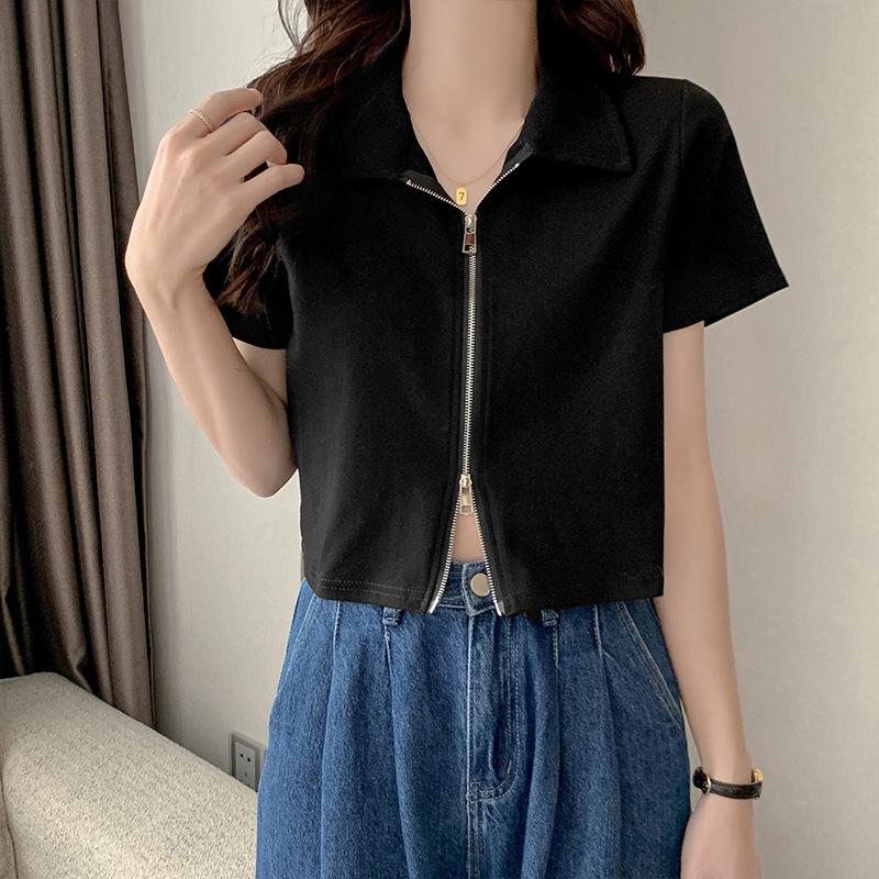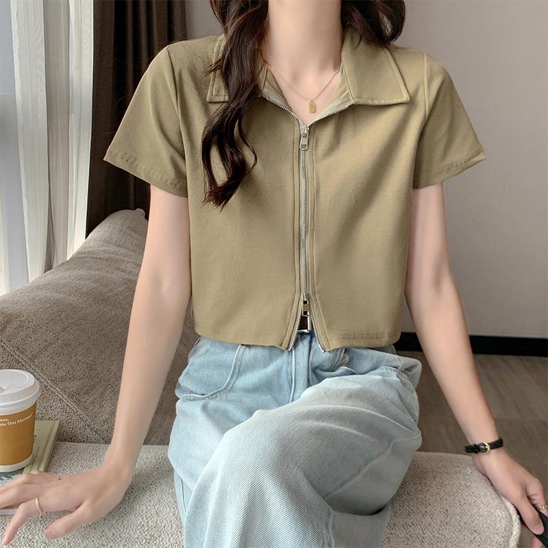 Французский дизайн Поло лацкан короткий рукав женская футболка летняя тонкая нишевая модель молния короткий рукав короткий топ