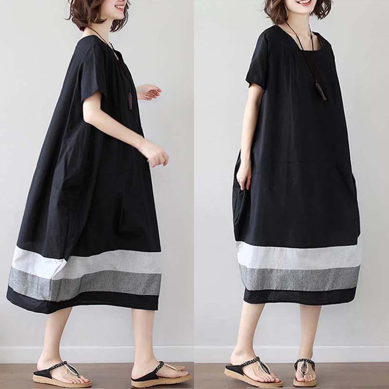 Летнее корейское свободное платье большого размера в полоску из хлопка и льна с короткими рукавами для женщин, повседневные платья средней длины