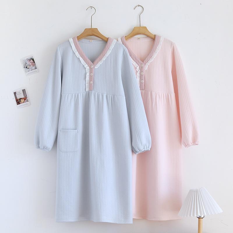 Осень и зима Новая женская длинная юбка утолщенная термо ночная рубашка 100% хлопок хлопковый зажим с длинным рукавом домашнее платье пижамы