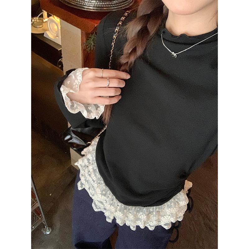 Футболка женская с кружевом и грибковым кружевом, полувысоким воротником и длинными рукавами, осенне-зимняя, бархатная, теплая, с внутренним воротником-стойкой