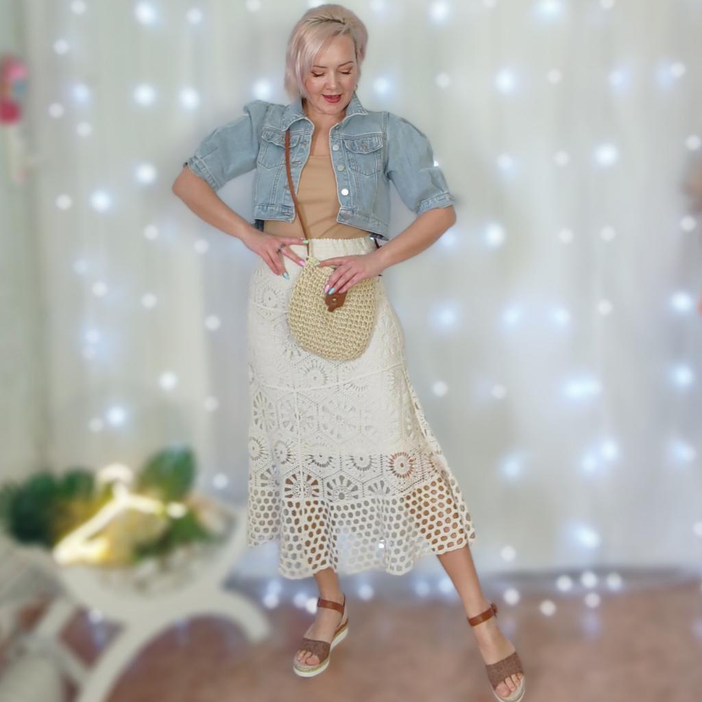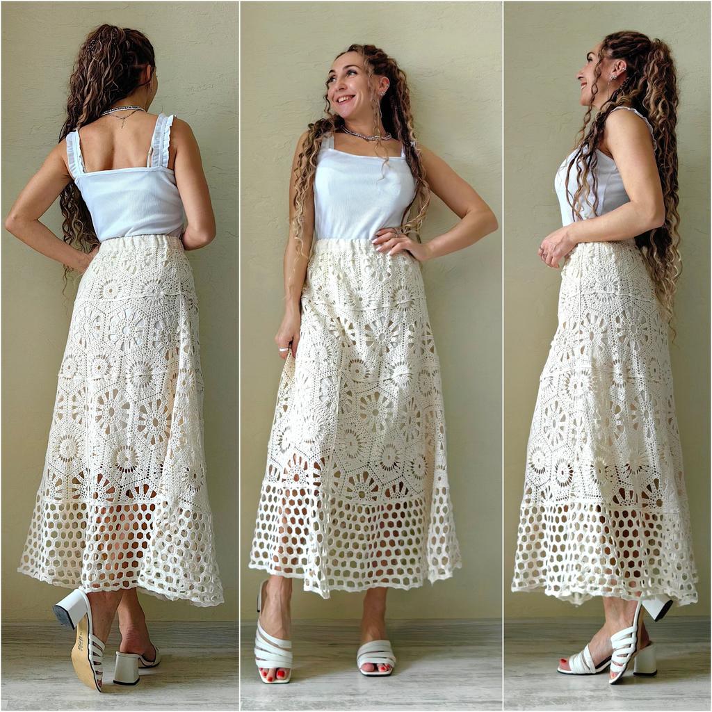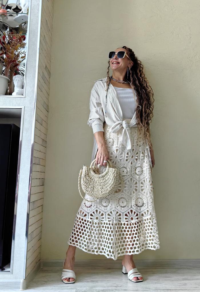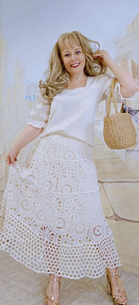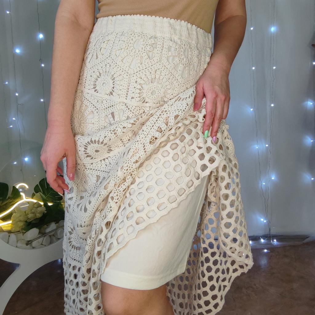 Кружевная юбка в бохо стиле! Привет! Восторг девчат! Это не юбка это какой то подарок поднебесной! 😅 Очень удачная модель! ‼️Добавила разговорное видео посмотрите перед покупкой там больше деталей ‼️ Ткань : Сшита юбка из двух видов ткани: Основная это нитка сплетенная в кружево. То есть это не кружевное полотно с дырочками, а именно кружево. Нитка очень похожа на хлопок, хотя я думаю это не он, но полотно приятное и чуть тянется. Внутри подкладка из тонкой ткани с стрейч эффектом. Дизайн: Юбка макси. Сшита в формате трапеция к низу немного расширяется. На талии комфортная резинка. Молний и пуговиц нет. Размер: На мне единый размер. Мои параметры : рост 172 см 98/76/106 см Детали : Длина 90 см ОТ 72 до 110 см ОБ 140 см Резюмирую: Классная! На лето самое то! Обратите внимание она не чисто белая. Смотрится очень круто ещё и стройнит не смотря на свой светлый цвет. Рекомендую 👍 Я не прощаюсь, M_K #кружевное_бохо
