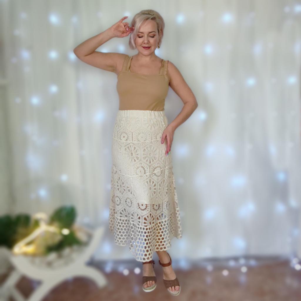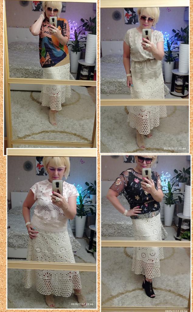 ❇️Юбка от бренда DIMANAF ❇️ ❇️ Делюсь впечатлением о юбке, которую приобрела к такой же блузочке, чтобы составить комплект!!! Комплект ,девочки,получился ШИКАРНЫЙ 👍❤💥!!! Слов нет!!! Но, как уже ранее писалось, носить юбку можно с любым подходящим верхом, обувью классической, на каблуках, босоножками в стиле "бохо", балетками. Вобщем смотрится великолепно в разных стилях. Это очень достойная вещь в гардеробе! 👍❤💥‼️ ❇️Цвет бежевый. ❇️Вязка ажурная машинная! Красивенная!!! 👍 ❇️По составу 65%хлопка и 35%полиэстера. ❇️Верх на резинке. ❇️Расклешенная к низу. ❇️Имеется трикотажный подклад, эластичный , тактильно приятный. По длине чуть ниже колена. Сама юбка по длине мне до щиколотки. (рост 164см.)Край юбки неровный, в середине длиннее, по бокам короче. ❇️На мои параметры 102/80/102 села идеально💯✨! ❇️Прекрасно выполнена работа по пошиву изделия, без замечаний! ❇️Очень рада такому приобретению💓От души рекомендую 🙌👍💓😘😘😘‼️P.S.Надевала сегодня первый раз юбку с кофточкой,😊 видела косые взгляды 🤩😉. Прям, чувствовала, как мне все завидовали🤭😊😂! Одна незнакомая женщина ,идя мне навстречу,даже сказала:"Простите! У вас такой красивый наряд... Где берут такие вещи!? "....Не...ну правда!🤗 😄,я не шучу☝!!!Так что ещё раз убедилась, что не зря приобрела эту красоту 🥰😛😘!!!Я довольнаЯЯЯ🥰🤩🤗!!!
