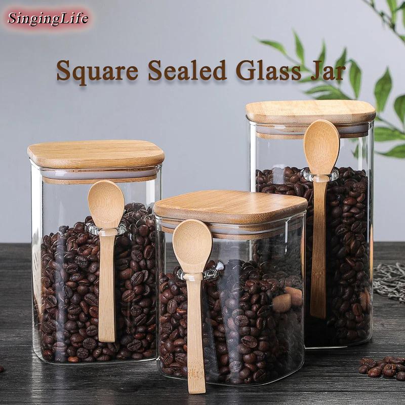 800-1200 мл квадратная герметичная стеклянная банка с деревянной ложкой стеклянная банка для хранения кофейных зерен контейнер для хранения приправ кухонные принадлежности