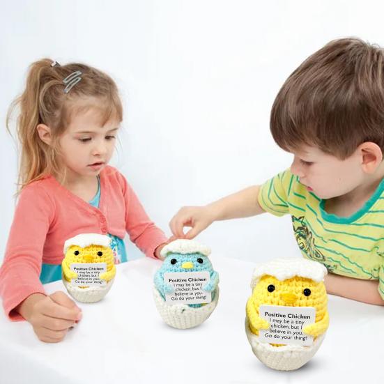 Мини-вязаная крючком курица с позитивной открыткой, ручная работа, пряжа, вязание, сине-желтая кукла, игрушка для снятия стресса, украшение для домашнего офиса и рабочего стола